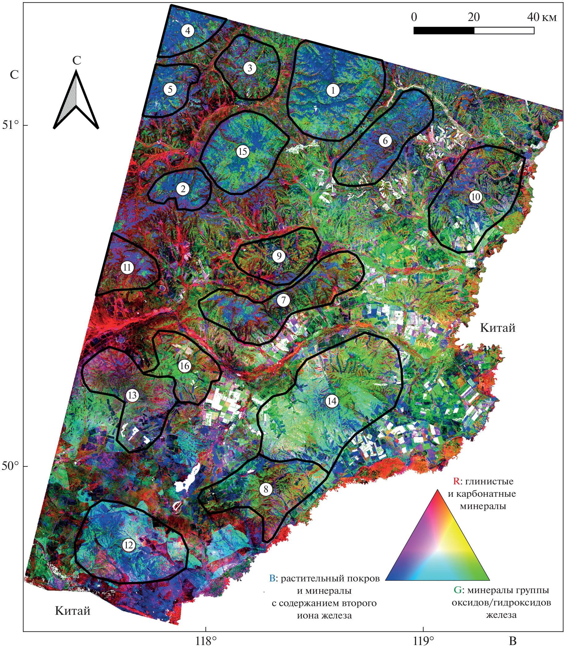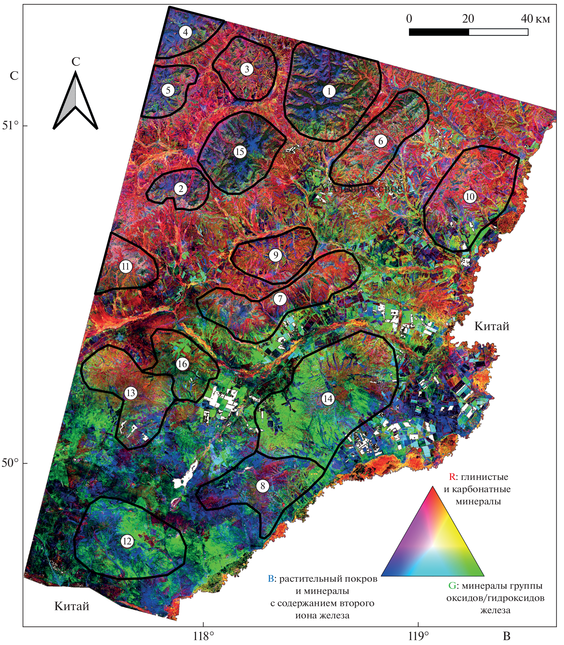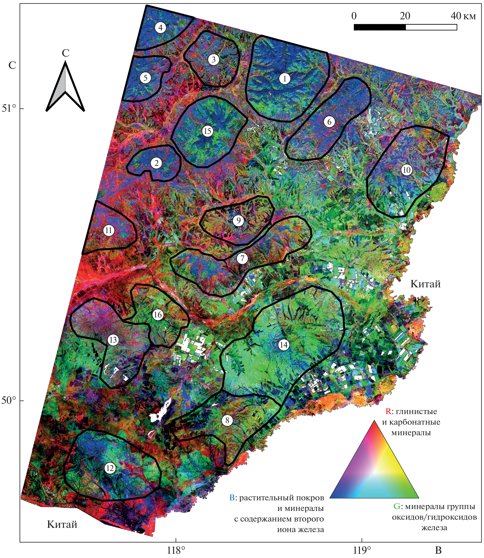 The work considers the suitability of using multispectral satellite remote sensing data Landsat-8 for conducting regional geological and mineralogical mapping of the territory of south-eastern Transbaikalia (Russia) in conditions of medium- low-mountain relief and continental climate. The territory was chosen as the object of study due to its diverse metallogenic specialization (Au, U, Mo, Pb-Zn, Sn, W, Ta, Nb, Li, fluorite). Diversity in composition and age of ore-bearing massifs of intrusive, volcanogenic and sedimentary rocks are also of interest. Statistical processing algorithms to increase spectral information content of satellite data Landsat-8 were used; they include: principal component analysis (PCA); minimum noise fraction (MNF) and independent component analysis (ICA). Eigenvector matrices analysed on the basis of statistical processing results and two-dimensional correlation graphs were built to compare thematic layers with geological material classes: oxide/hydroxide group minerals containing transition iron ions (Fe3+ and Fe3+/Fe2+); a group of clay minerals containing A1–OH and Fe, Mg–OH; minerals containing Fe2+ and vegetation cover. Pseudo-coloured RGB composites representing the distribution and multiplication of geological materials classes was generated and interpreted. Integration of informative thematic layers with using fuzzy logic model was carried out to construct a prospectivity map. Received map was compared with geological information, and positive conclusions about territory suitability for further remote mapping research of hydrothermally altered zones and hypergenesis products in order to localize areas promising for identifying hydrothermal-metasomatic mineralization were made.