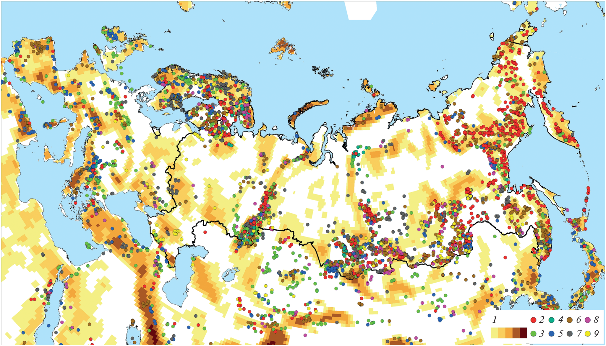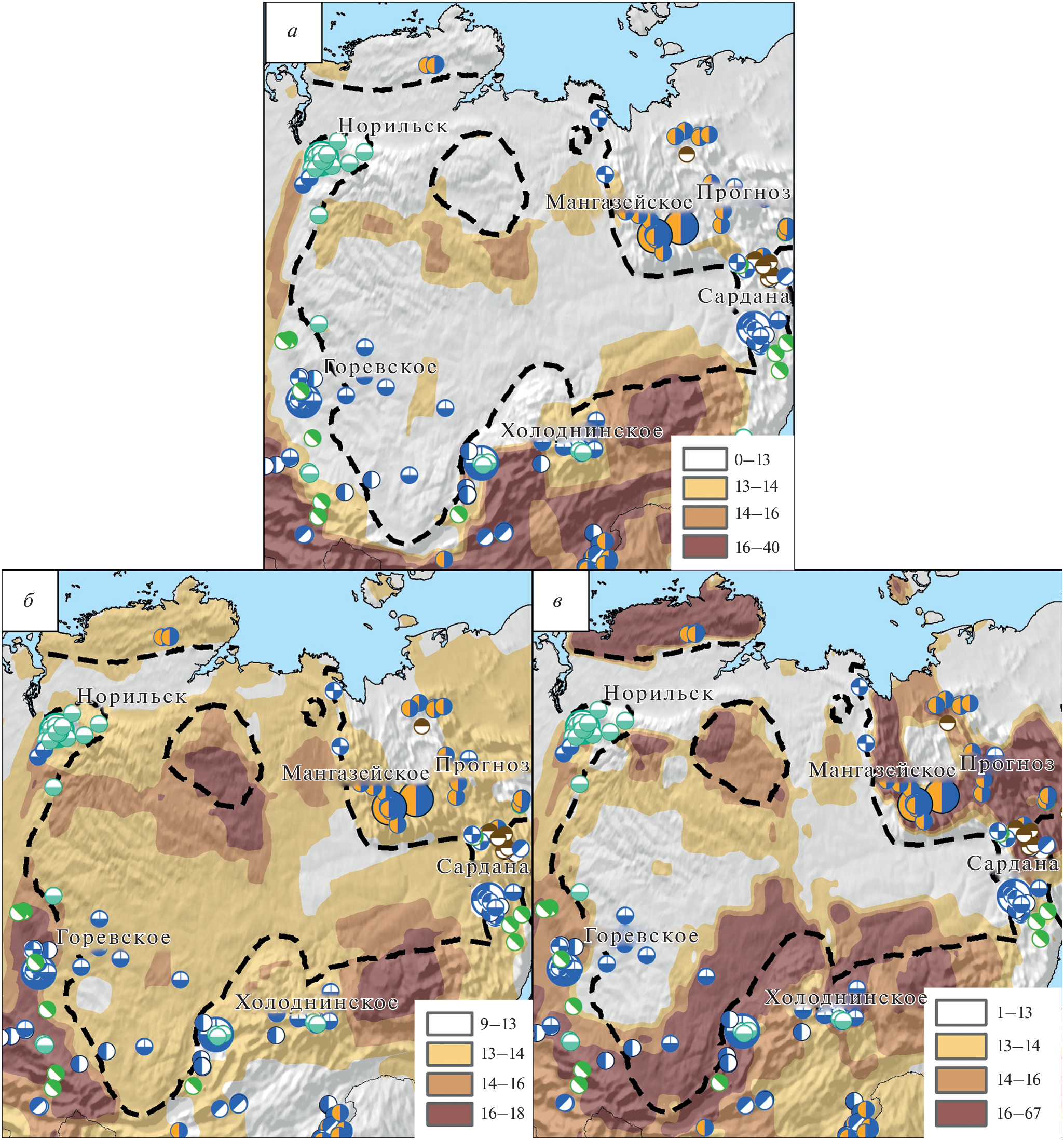 The results of recent study of the Earth’s crust based on the gravity data of the GOCE satellite were used for a comparative metallogenic analysis of the geodynamic settings of polymetallic deposits in the folded frame of Siberian and East European platforms. It is shown that deposits of the SEDEX type are more often located in the earth’s crust with the predominant development of the lower “basalt” layer. Pyrite copper and lead-zinc deposits (VMS), as well as some occurrences of the SEDEX type, are known in subduction island-arc and accretionary settings on the crust with the predominant development of the middle “granite” layer. Pb–Zn ores of the MVT-type are localized in deep pericratonic sedimentary oil&gas basins on the shelf and continental slope, with no spatial relationship with the stratification of the earth’s crust. The Ag-polymetallic mineralization of Taimyr and Western Verkhoyansk are confined to deep pericratonic rift troughs on the passive continental margin, have a similar ore-bearing environment and may be considered as a single silver-polymetallic Taimyr-West Verkhoyansk belt. The obtained results to confirm the prospects of Pb–Zn deposits in Central and Eastern Taimyr, as well as the Saurey ore region (Polar Urals) and the need for their further research.