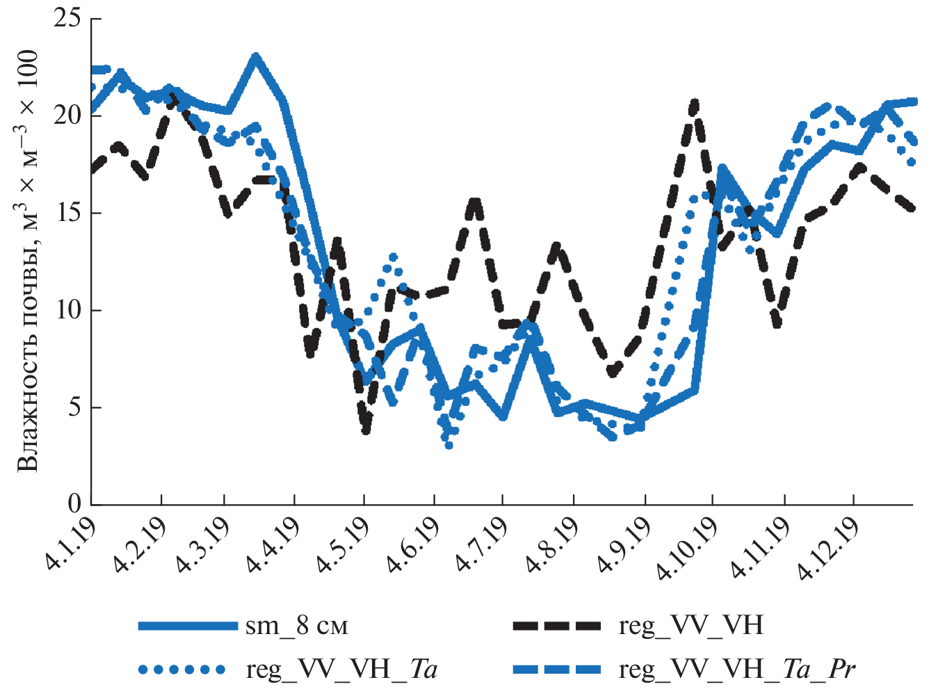 The task of soil moisture assessing by remote (satellite) methods remains relevant up to the present time. Regression models based on the correlation of radar data with ground measurements of soil moisture are constructed to assess soil moisture in the work. Ground-based measurements were taken at two stations in Germany (Falkenberg and Gevenich), which are part of the ISMN (International Soil Moisture Network) worldwide soil moisture data network. Sentinel-1 satellite data is used as radar data. Multiple regressions with a determination coefficient up to 0.91 are constructed. It is proposed to use not only radar, but also meteorological data in regressions, which allows increasing the coefficient of determination and reducing the standard error of regression. For the possible spread of regressions obtained for one territory to another territory, two criteria are selected: the proximity of the values of the Selyaninov hydrothermal coefficient and the similarity of the soil texture. According to these conditions, two stations in the Ryazan region and in Kalmykia were chosen, whose archival information on soil moisture is contained in the ISMN database up to 1998. Each of the selected stations satisfies only one of the criteria.