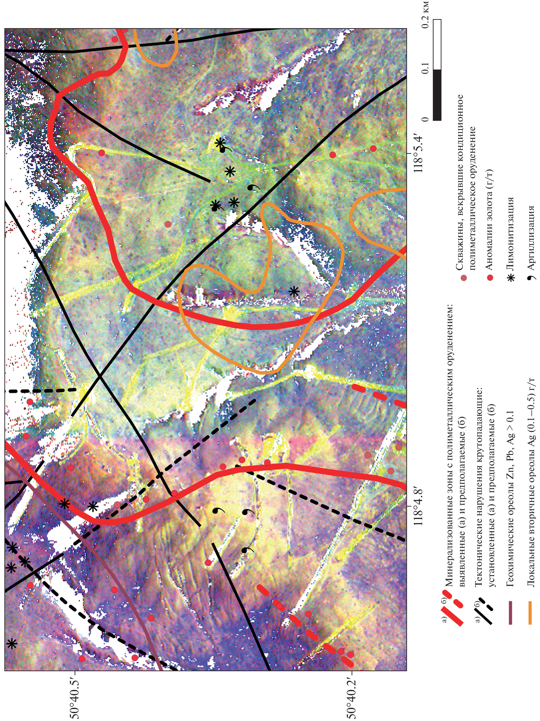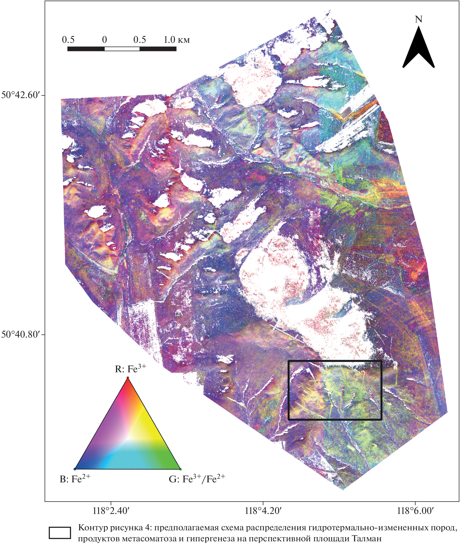 Работа направлена на практическое применение данных космической съемки для выбора перспективных участков при геолого-разведочных работах в условиях средне-низкогорного рельефа и резко континентального климата. Изложены результаты обработки и анализа данных WorldView-2 в пределах Талманской площади с целью выявления зон гидротермально-метасоматических изменений горных пород, перспективных на выявление золото-полиметаллического оруденения. Выбор площади исследования обусловлен достаточной геологической изученностью и отсутствием техногенных образований, влияющих на результат обработки материалов космической съемки. Для повышения спектральной информативности данных WorldView-2 использован метод отношения спектральных каналов, по результатам которого создан псевдоцветной RGB композит, отображающий спектральные характеристики объектов дневной поверхности Земли, в частности, минералов группы оксидов/гидроксидов, содержащих переходные ионы железа (Fe3+ и Fe3+/Fe2+). Сопоставление результатов обработки спутниковых данных наряду с геологической информацией позволило идентифицировать спектральные аномалии, как индикаторы наличия околорудных изменений, являющихся важным поисковым критерием гидротермальных месторождений.
