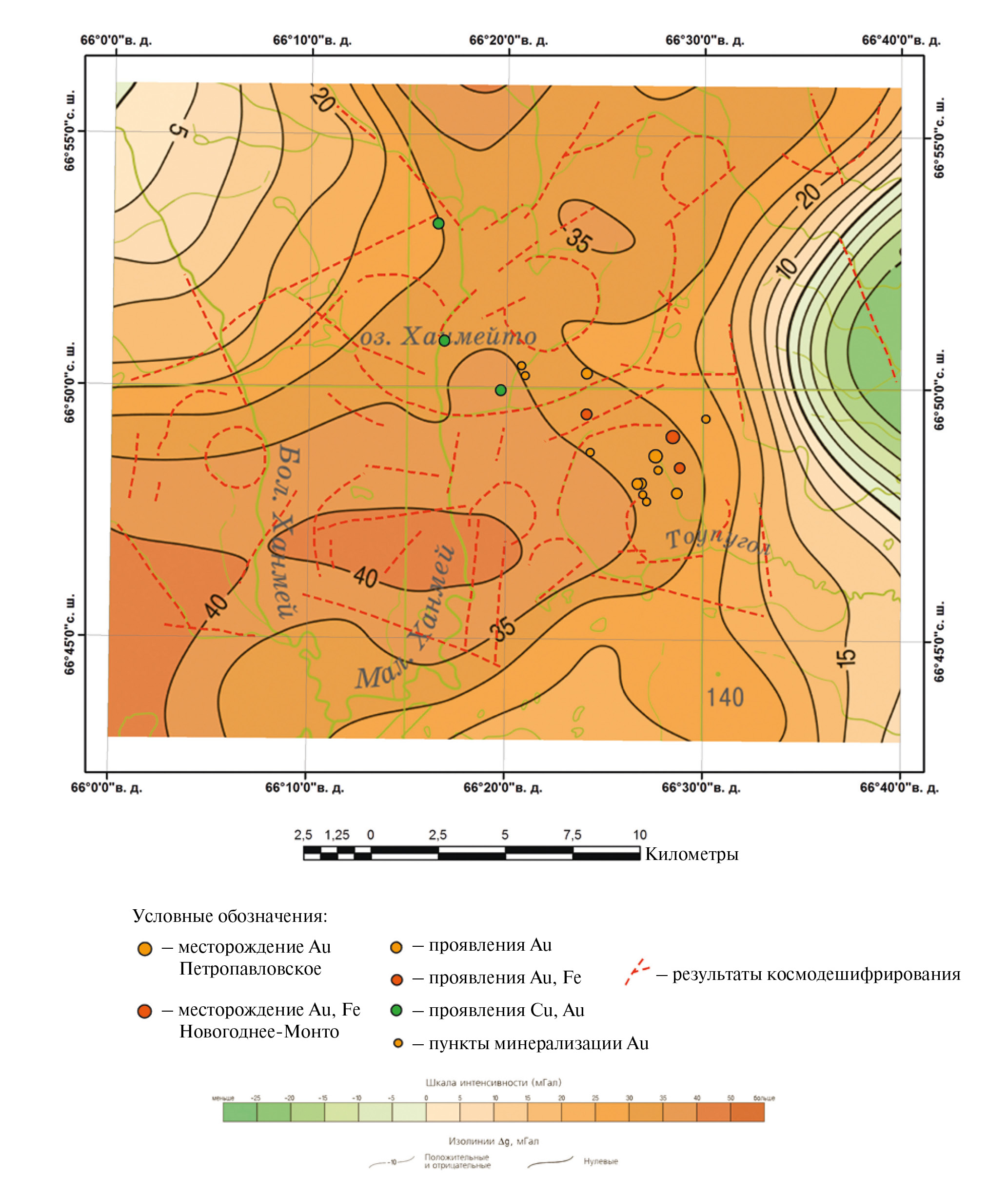 В магнитном поле эти две кольцевые структуры, обозначим их как Петропавловская и Ханмейшорская, существенно различаются. Значения магнитного поля Петропавловской структуры варьируют в пределах +50 ÷ +200 нТл (рис. 3), к этой структуре относятся 80 % золоторудных объектов, включая месторождения Петропавловское и Новогоднее-Монто. Ханмейшорская кольцевая структура расположена в области отрицательных значений магнитного поля, только в южной ее части, где развиты вулканиты соколинской свиты, отмечены положительные значения магнитного поля. Гравитационное поле в узком интервале значений +30 ÷ +35 мГал отличает более 90 % золоторудных объектов исследуемой площади (рис. 4). Петропавловская и Ханмейшорская кольцевые структуры характеризуются значениями гравитационного поля +25 ÷ +40 мГал.