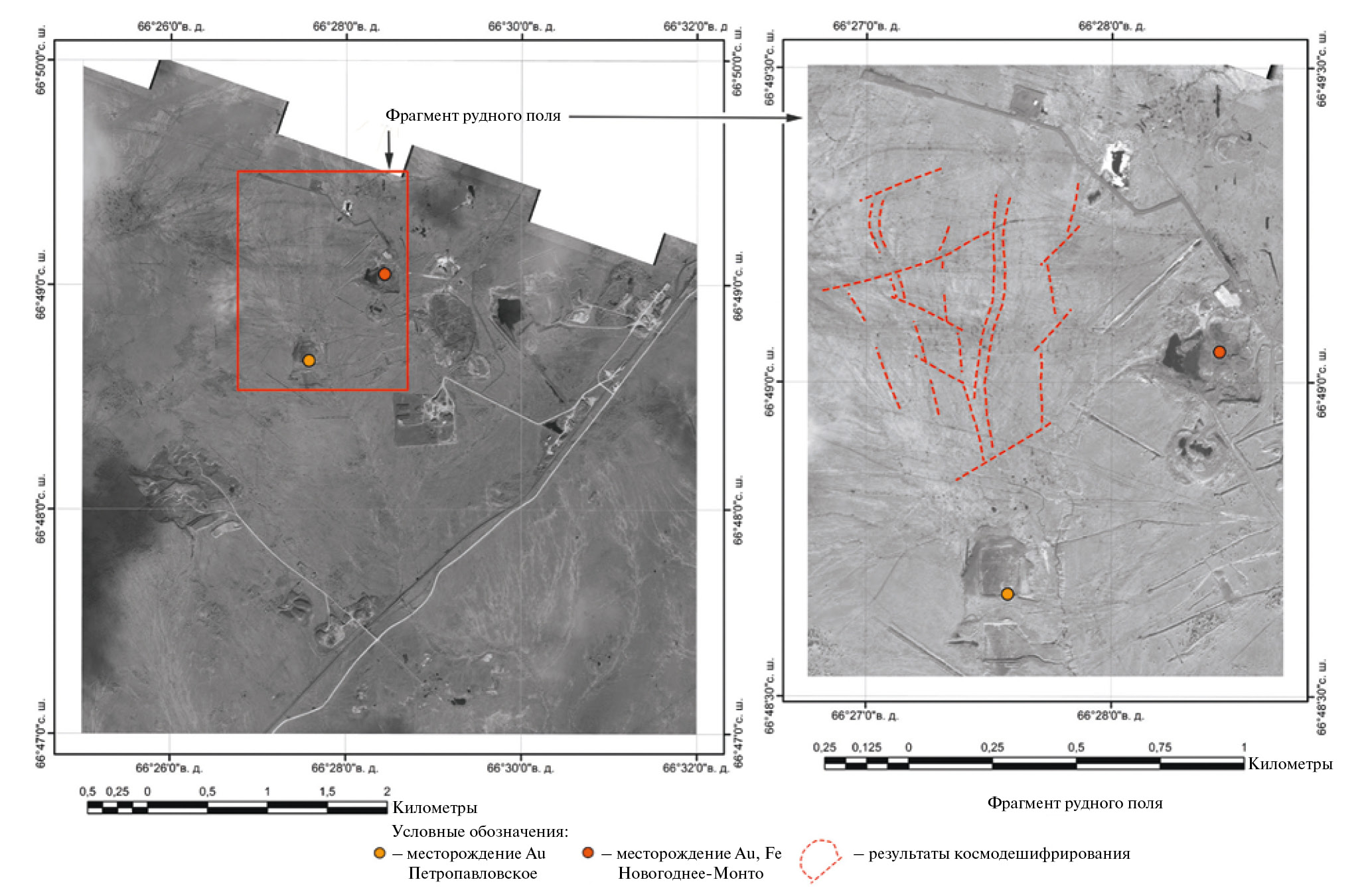 Детализация Новогодненской площади (рис. 5) с месторождениями Новогоднее-Монто и Петропавловское позволяет рассматривать Тоупугольский разлом как дуговую структуру, ограничивающую с запада выявленную при космодешифрировании Петропавловскую кольцевую структуру, в пределах которой расположено Новогодненское рудное поле.
