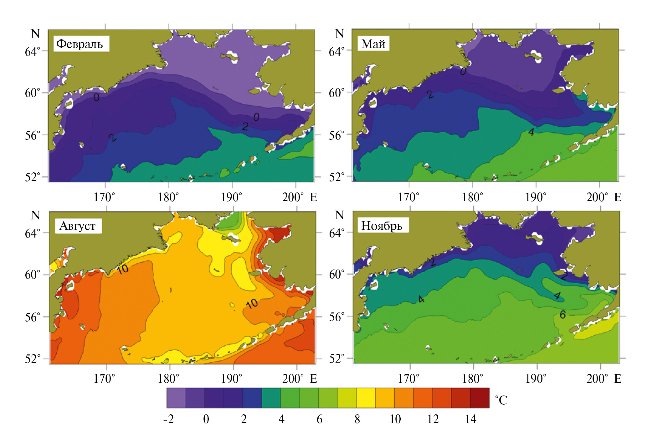 Рис. 2. Пространственное распределение ТПМ (°C) на акватории Берингова моря зимой (февраль), весной (май), летом (август) и осенью (ноябрь).
