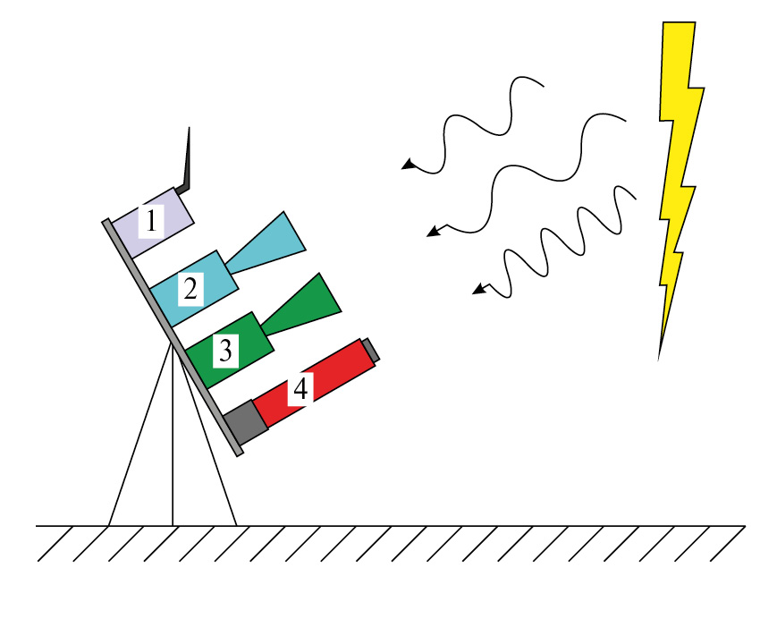 Рис. 1. Схема установки для регистрации предполагаемого электромагнитного излучения, при фотоядерных реакциях. 1 – низкочастотный регистратор молниевого разряда; 2, 3 – микроволновые радиометры; 4 – гамма-дозиметр.