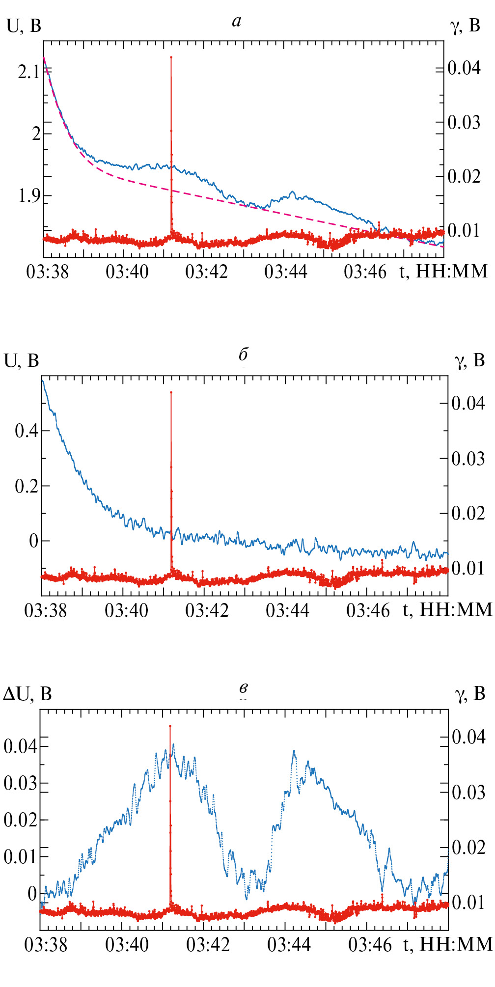 Рис. 3. Запись интенсивности микроволнового излучения и импульса гамма-излучения в ночь со 2 на 3 августа 2022 в г. Чита: а – для длины волны 1.35 см; б – для длины волны 2.3 см; в – приращение сигнала на 1.35 см, вызванное высокоэнергетическими событиями в атмосфере (в единицах напряжения на выходе радиометра).