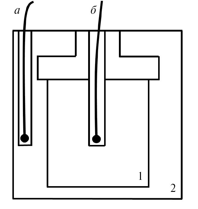 Рис. 1. Схематическое изображение ячейки в теплообменнике ТБ: 1 – термометрическая ячейка теплового блока с образцом вещества (масса образца находится в пределах 40–45 г); 2 – теплообменник; а – датчик температуры теплообменника (контрольный); б – датчик температуры образца.