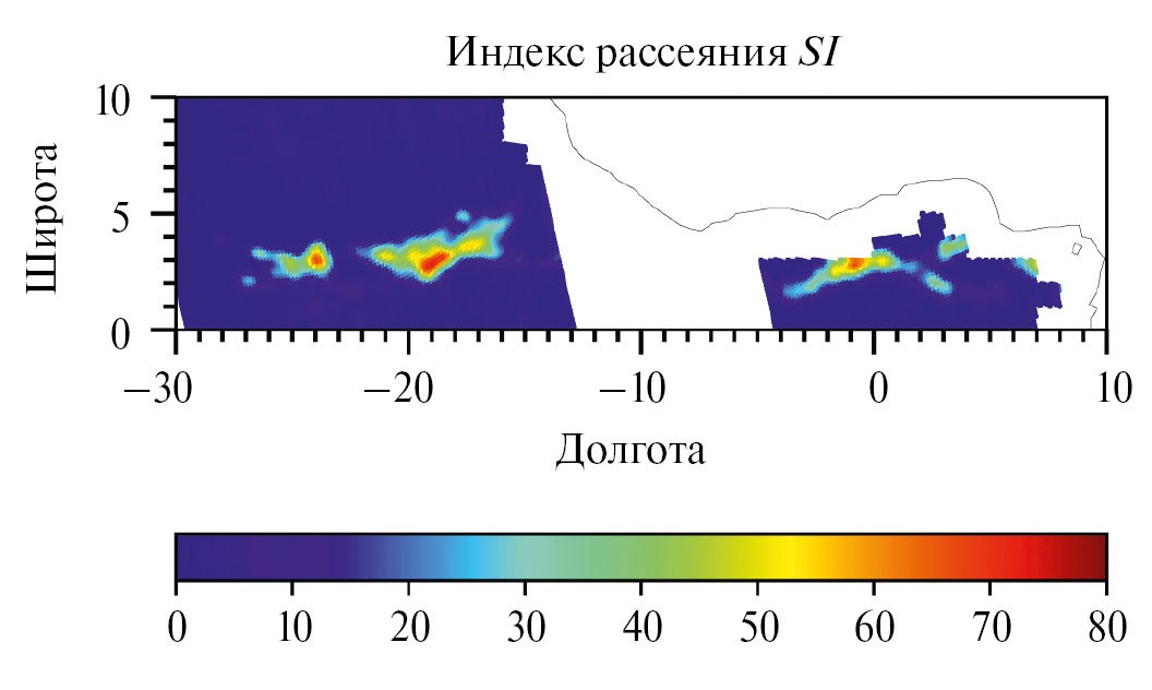где F – некоторая функция, выраженная в виде суммы радиояркостных температур (с разными весовыми коэффициентами) на частотах, отличных от 91.65 ГГц, и характеризующая каким могло бы быть излучение на частоте 91.65 ГГц в отсутствии рассеяния; – измеряемая прибором радиояркостная температура на частоте 91.65 ГГц (вертикальная поляризация). Известно, что при наличии рассеяния (на дождевых каплях), радиояркостная температура уменьшается. При этом расчет по формуле (1) всегда должен давать положительное значение параметра SI, а его абсолютное значение позволяет оценивать интенсивность осадков (количество рассеивателей в атмосфере). Детальный алгоритм построения функции F в уравнении (1) и последовательность операций, позволяющих выделять зоны с осадками, приведены в работе (Сазонов, 2023).