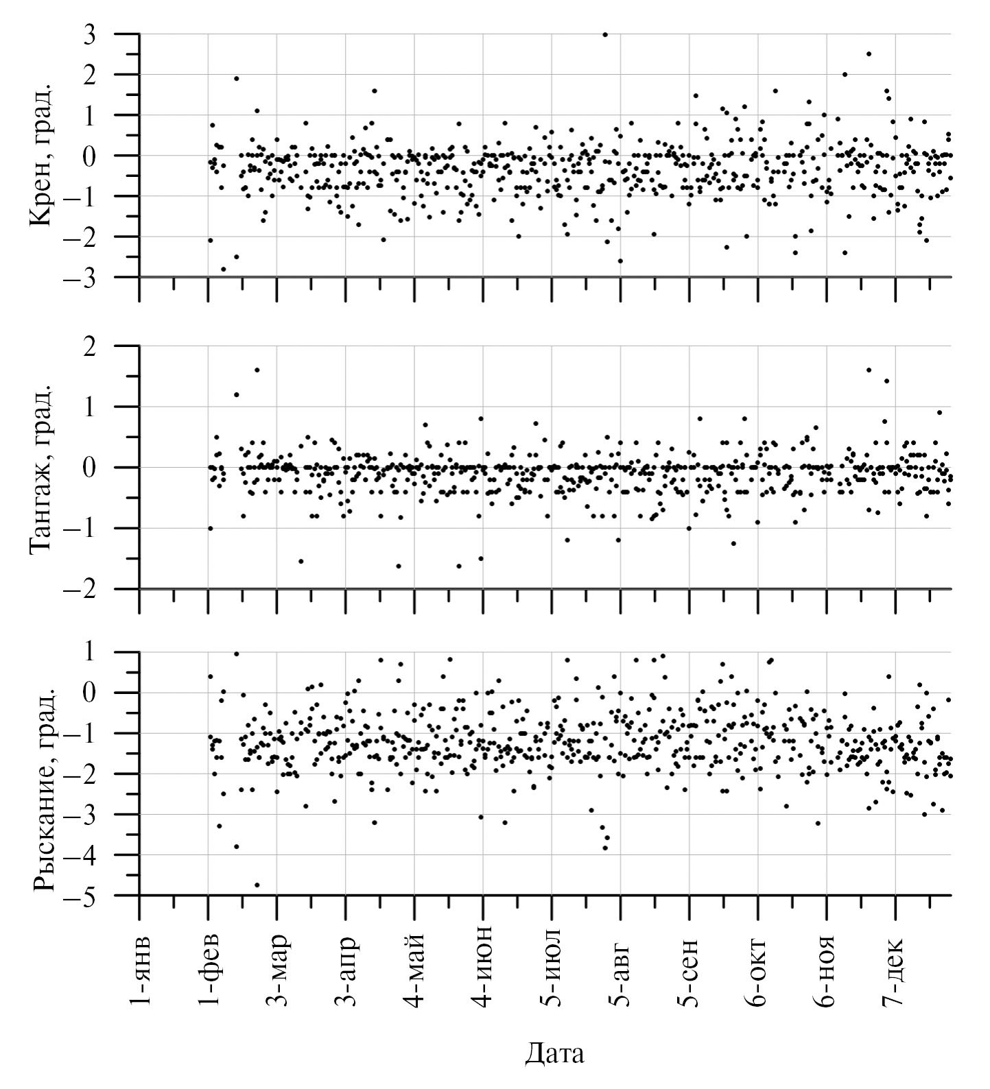Рис. 3. Результаты определения корректирующих углов крена, тангажа и рыскания по данным измерений МТВЗА-ГЯ на частоте 91.65 ГГц (V) за 2020 г. Каждая точка – результат обработки данных за одни сутки.