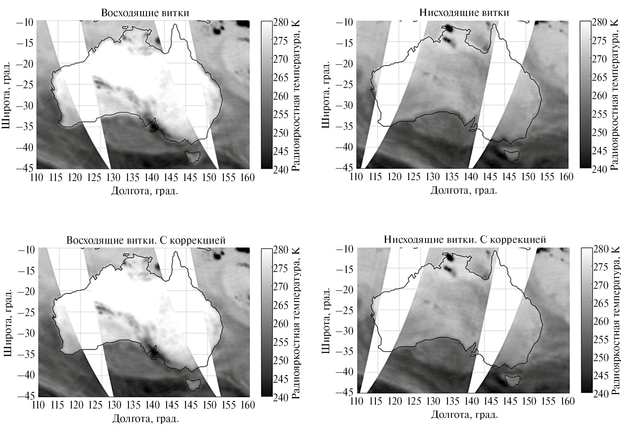 На рис. 4 приведены карты геопривязанных данных МТВЗА-ГЯ для частоты 91.65 ГГц (V). На верхних картах показаны данные, которые были предоставлены сотрудниками АО РКС. Здесь геопривязка выполняется программой предварительной обработки данных с использованием корректирующих углов, рекомендованных в работе (Садовский, Сазонов, 2023). На нижних картах – аналогичные данные после внесения в процедуру геопривязки указанных выше корректирующих углов. Визуальная оценка полученных карт показала, что после коррекции береговая линия Австралии на радиометрических изображениях сместилась по направлению условной траектории движения спутника как восходящих, так и для нисходящих полувитков. Это обеспечило лучшее совпадение с географической береговой линией, отмеченной на рисунке черным цветом.