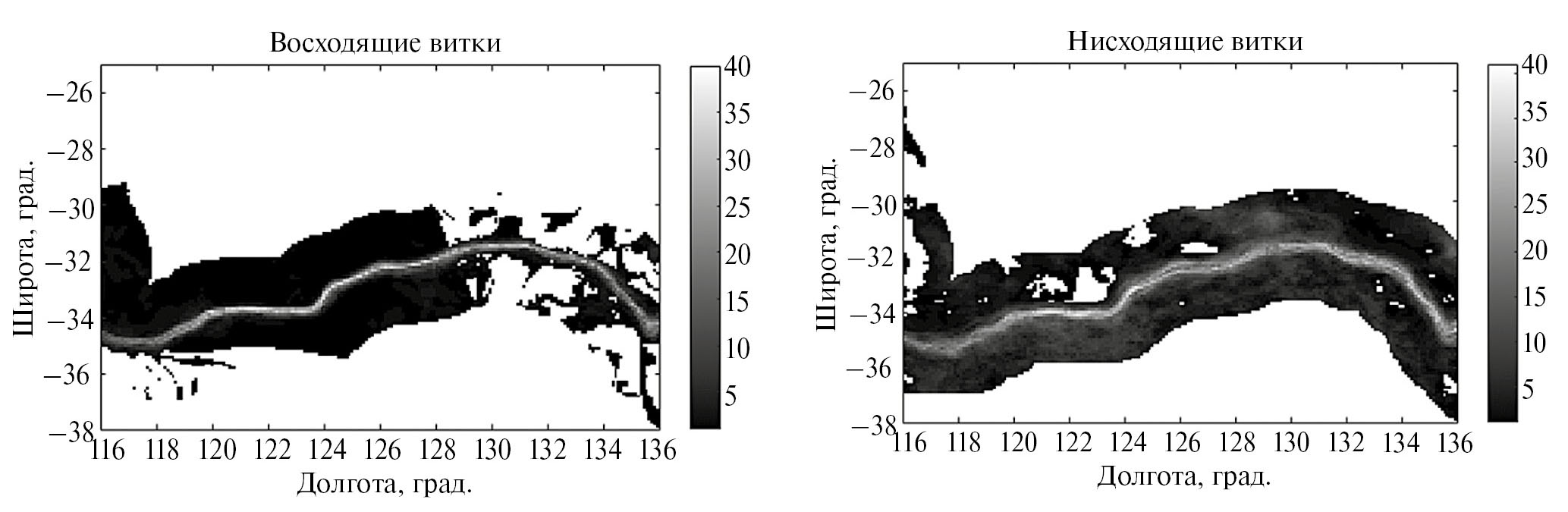 На представленных изображениях видно, что накопленные карты для восходящих и нисходящих витков отличаются. В частности, на карте для нисходящих витков наблюдается существенное размытие положения береговой линии. Это объясняется снижением разницы яркостных температур вода-суша в ночное время, приводящее к росту влияния на алгоритм выделения береговых линий даже малых изменений состояния атмосферы. Несмотря на размытость, благодаря большому накоплению данных даже карты для нисходящих полувитков позволяют достаточно четко выделять искомую береговую линию. Для региона северной Америки карты накопленных данных выглядят аналогично.
