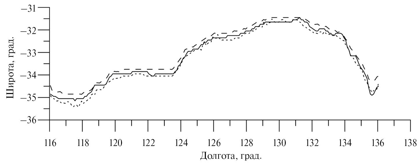 Рис. 6. Найденные береговые линии с геопривязкой по областям осадков. Пунктир – по восходящим виткам, точки – по нисходящим виткам. Сплошная – точная береговая линия.