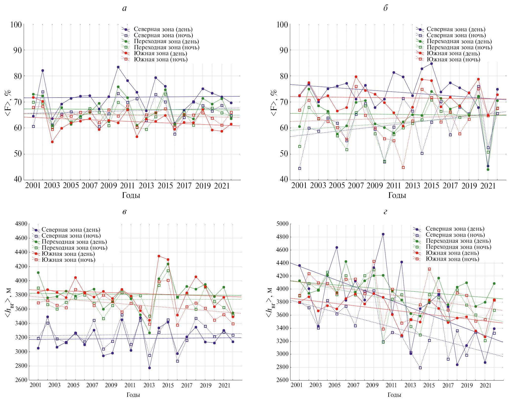 На рис. 1 показаны графики межгодовой изменчивости летних и зимних значений доли покрытия различных широтных зон целевого региона облаками и высоты верхней границы облачности в ночное и дневное время за период 2001–2022 гг. Из рис. 1 видно, что значения <F> и <hВГ> летом в целом описываются нейтральными трендами в переходной и северной зонах Западной Сибири и убывающими – в южной. Для зимы наблюдается более сложная картина. Если для высоты верхней границы ночной и дневной облачности характерен нейтральный тренд (который наиболее ярко выражен в северной зоне) для всей Западной Сибири, то для доли покрытия ночными облаками он положительный во всех зонах, а дневными – нейтральный в переходной и южной, и отрицательный в северной. Интересной особенностью являются большие межгодовые колебания значений <F> и <hВГ> в зимний сезон по сравнению с летним, превышающие 20% и 1000 м соответственно. При этом летом годы наблюдения аномалий во временных рядах доли покрытия облаками и высоты их верхней границы в большинстве своем совпадают для дневного и ночного времени, а зимой имеются различия. Так, максимальные зимние значения <hВГ> в северной зоне днем зарегистрированы в 2010, а ночью – в 2009 году. Следовательно, анализ причин наблюдения аномалий во временных рядах характеристик ночной и дневной облачности следует проводить по-отдельности. В частности, это позволит рассмотреть солнечную активность в качестве одного из сопутствующих факторов их возникновения (Eastman, Warren, 2014).