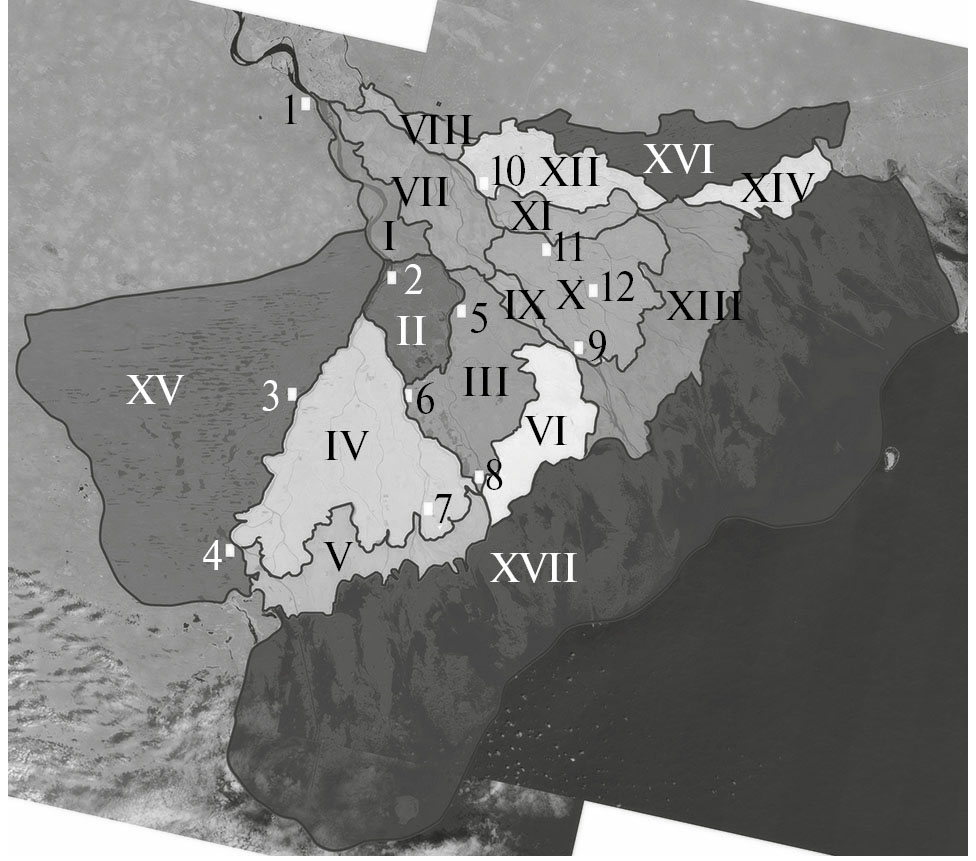 В настоящей работе использовано районирование по В.Ф. Полонскому, разделяющее ДВ на 16 районов (рис. 1) (Полонский, 2003). Разделение дельты выполнено по 5 основным признакам: