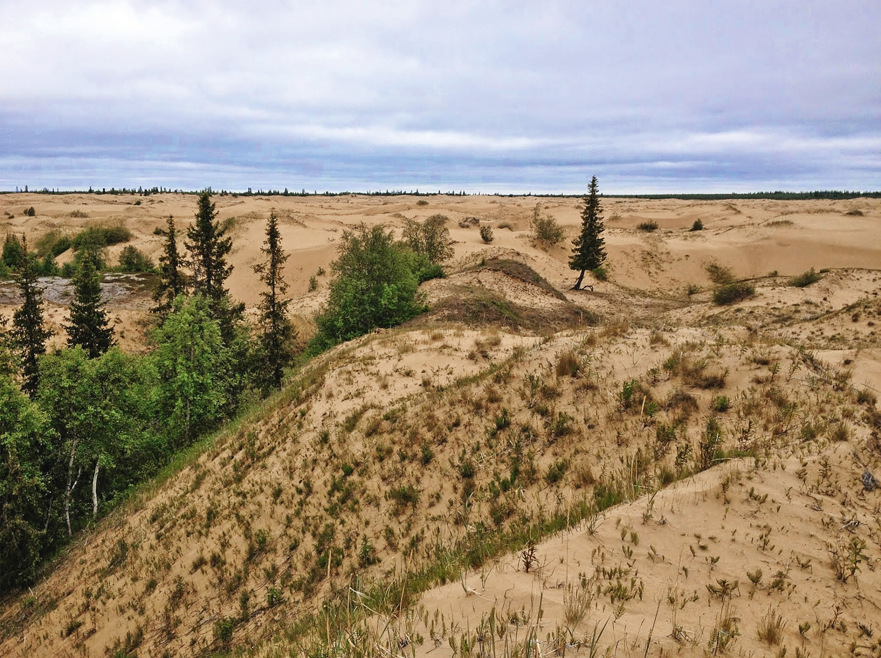 Рис. 3. Снимок грядового песчаного рельефа с растительностью (Picea obovata, Betula tortuosa, Carex Arctisibirica) в межгрядовых понижениях (С. Андрианов) (67°29′ 05′′ с.ш., 52°52′ 49′′ в.д.)