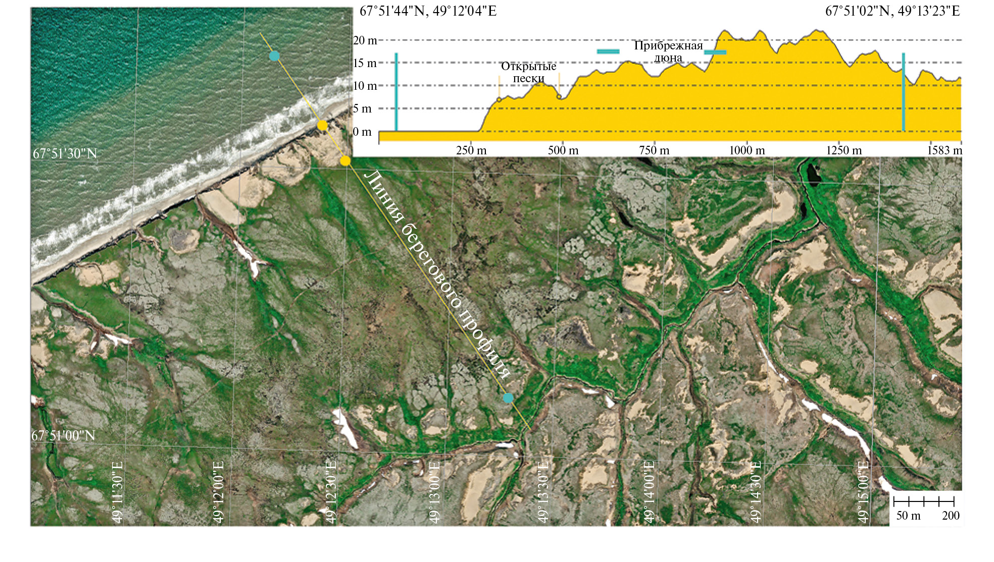 На космокарте показана линия профиля и профиль береговой зоны. Анализ цифровой модели рельефа позволил установить геоморфологические характеристики береговой зоны (табл. 3).