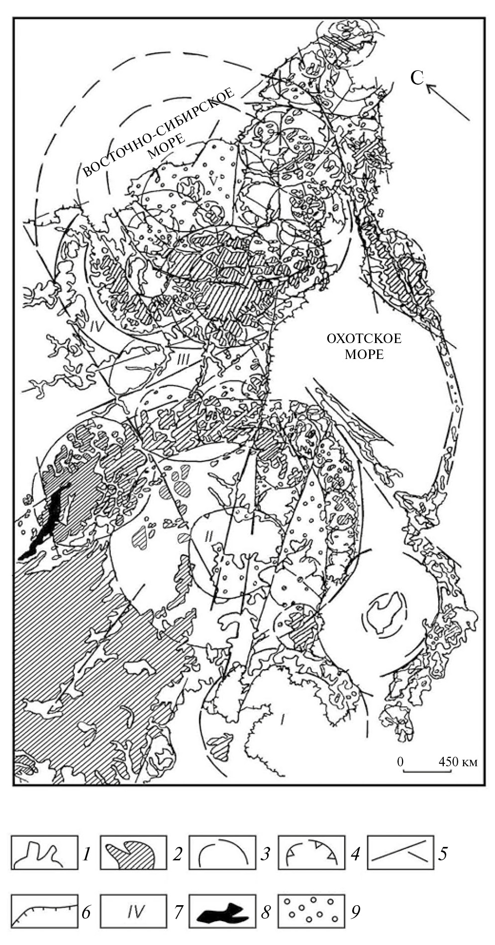 1–2 – контуры площадей с высотами рельефа: 1 – от 200 до 1000 м, 2 – более 1000 м; 3–5 – каркасные системы разломов: 3 – кольцевые и дуговые, 4 – дуговые центральной опущенной части Восточно-Азиатского (Амурского) мегасвода, 5 – радиальные и сквозные трансрегиональные; 6 – береговая линия; 7 – римские цифры названия МЦТ: I – Корейская, II – Восточно-Азиатская (Амурская), III – Алданская, IV – Янская, V – Яно-Колымская; 8 – озеро Байкал; 9 – межгорные впадины с высотами рельефа менее 200 м.