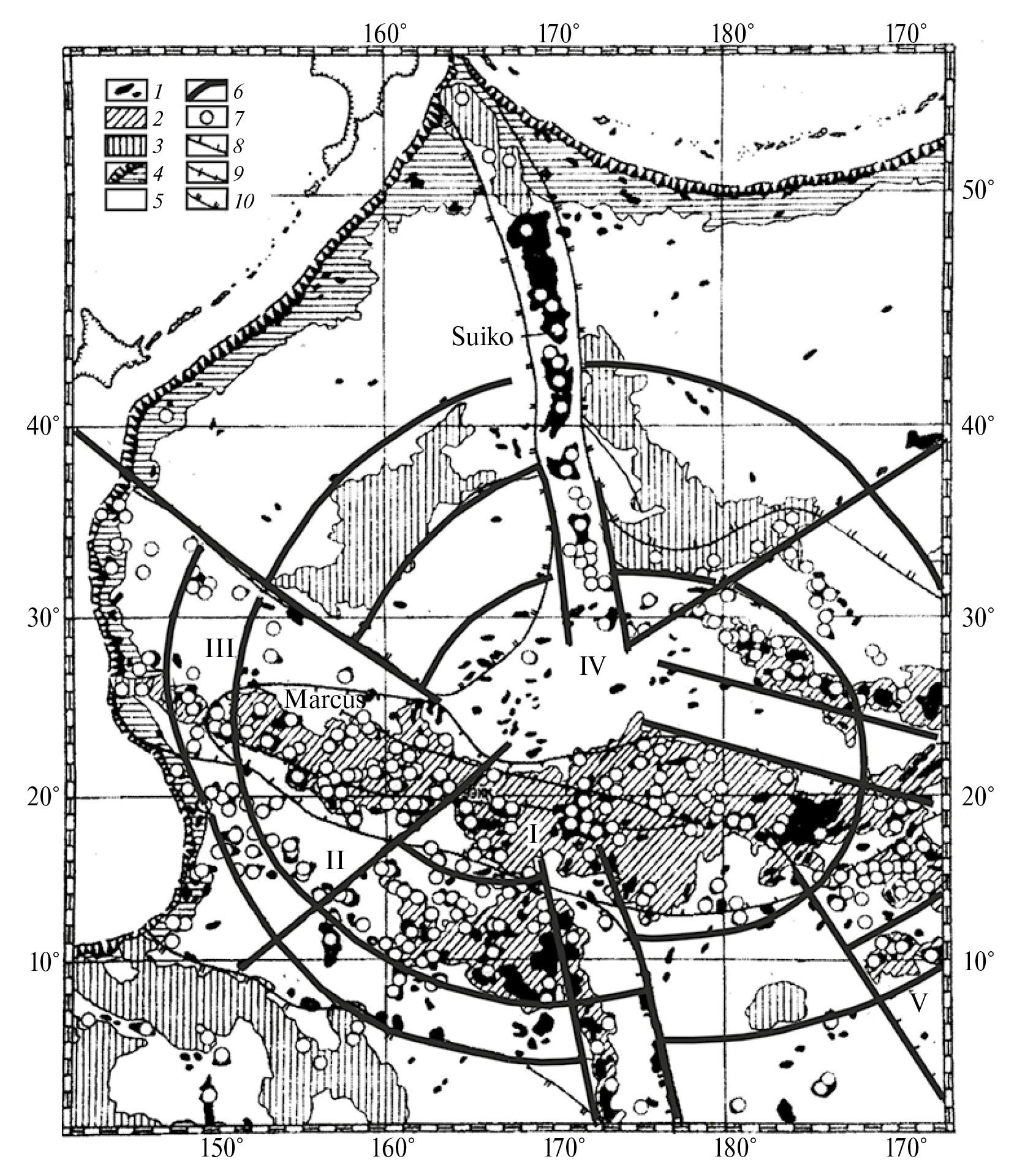 1 − подводные горы и хребты; 2 − валообразные поднятия в основании вулканических гор; 3 − подводные поднятия (Шатского, Гесса и другие); 4 – краевые валы и океанические склоны глубоководных желобов; 5 − океанические котловины; 6 − радиальные и дуговые каркасные линеаменты надплюмового мегасвода северо-западной части Тихого океана; 7 − подводные горы и гайоты с батиметрическим положением вершин не более 2000 м; 8 − границы рудоносных провинций: I – Срединно-Тихоокеанской, II − Восточно-Марианской, III – Огасавара-Гейш, IV − Императорско-Гавайской, V − Лайн; 9 – контур распространения фосфатизированных базальтов внутри ареала карбонатных и брекчированных фосфоритов Срединно-Тихоокеанской провинции; 10 − области практического отсутствия рудоносных гайотов.