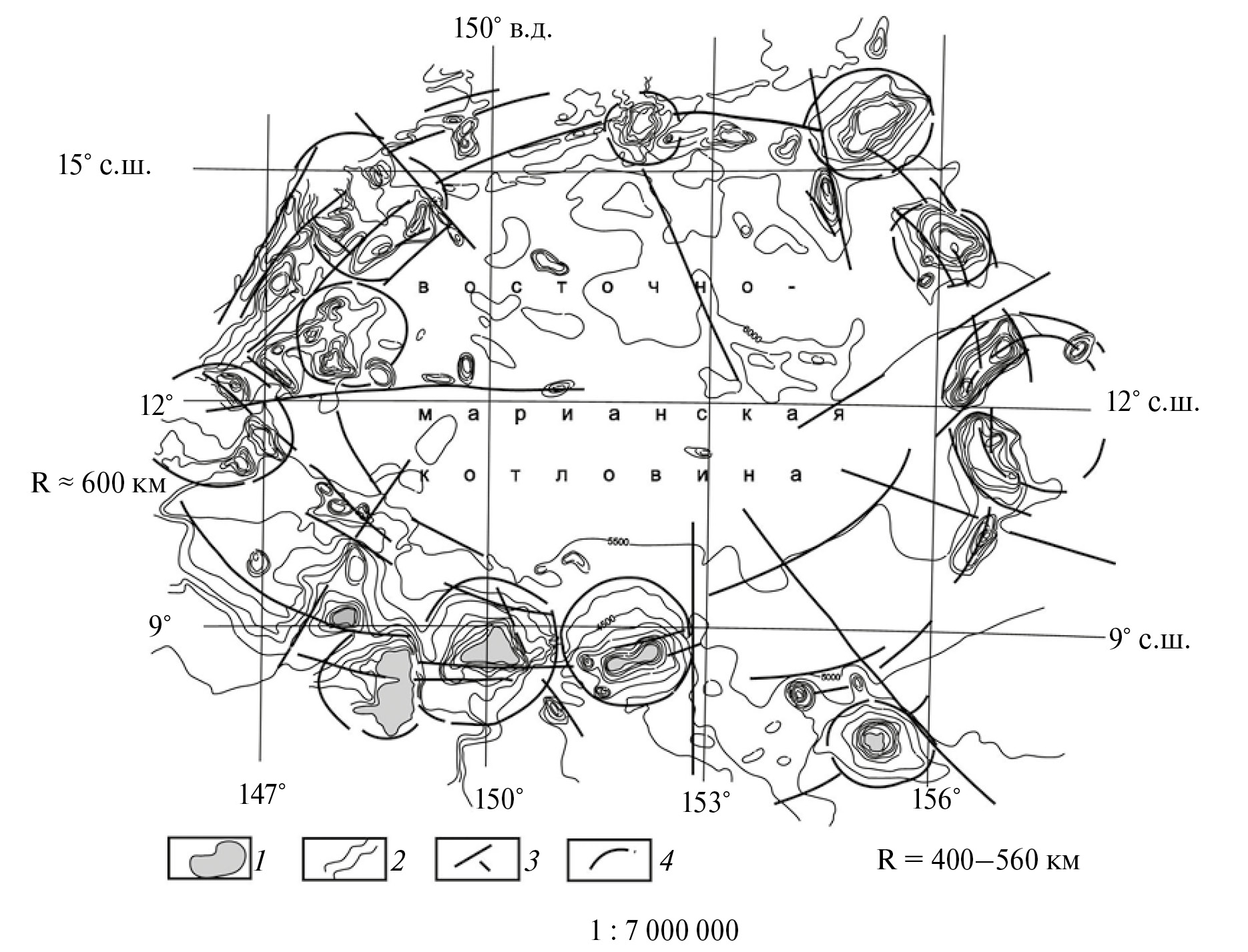 Рис. 7. Морфоструктурная схема Восточно-Марианской глубоководной котловины и обрамляющих ее подводных горных сооружений. 1 – островная суша; 2 – изобаты; 3‒4 – разломы, установленные по геоморфологическим и космогеологическим данным: 3 – диаметральные; 4 – дуговые и кольцевые.