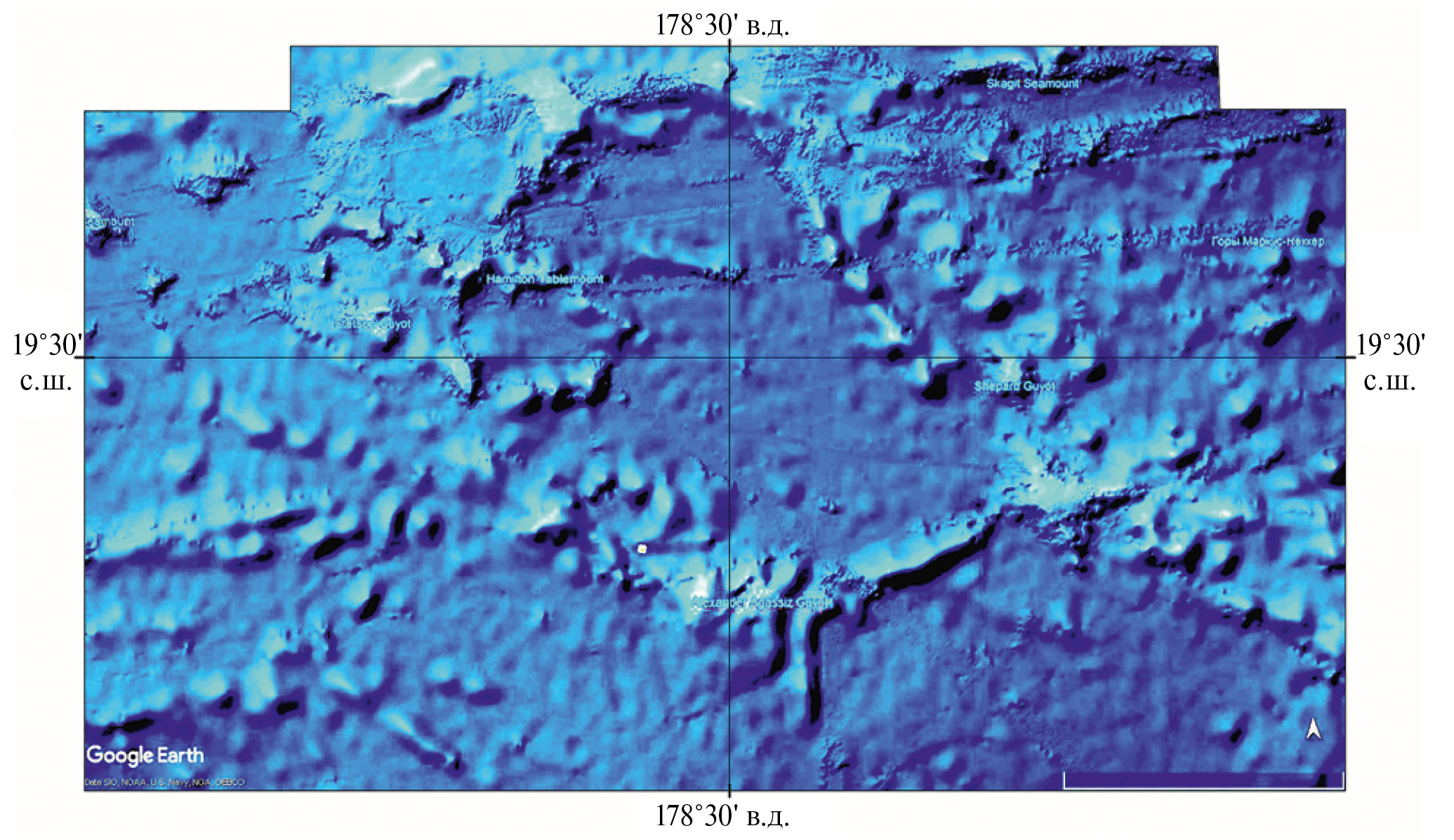 С учетом специфики морских геологических работ, геоморфологические и геофизические данные о строении и развитии подводного рельефа − основа индикации структурных элементов земной коры, проявлений вулканизма, характера и масштаба осадкообразования, определения структурной позиции рудной минерализации и т.д. Особенно эффективна роль геоморфологических методов при выделении, идентификации и изучении зон разломов, очаговых систем, выраженных МЦТ, которые создают необходимые энергетические и геохимические условия для реализации процессов подводного рудогенеза (Кулаков и др., 1990; Gavrilov, 2018, 2022а, б и др.). Новые перспективы для изучения геологии дна морей и океанов связаны с визуализацией цифровых 3D моделей рельефа, создаваемых на основе глобальной базы батиметрических данных GEBCO 2014 (http://Ocean3dproects…), материалов альтиметрии и дистанционного зондирования Земли из космоса в рамках программы Google Earth Pro. В частности, хорошие результаты дает применение методик морфоструктурного анализа и космогеологического дешифрирования при работе с визуализированными 3D моделями рельефа подводных возвышенностей разного типа, ранга и выступов акустического фундамента, которые отличаются относительно небольшим чехлом рыхлых отложений.
