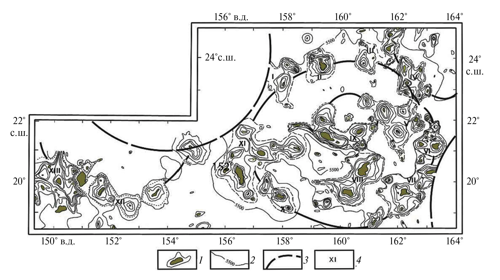 1 – гайоты; 2 – изобаты; 3 – каркасные дуговые и кольцевые разломы; 4 – римские цифры – названия палеовулканов и гайотов (здесь не приводятся).