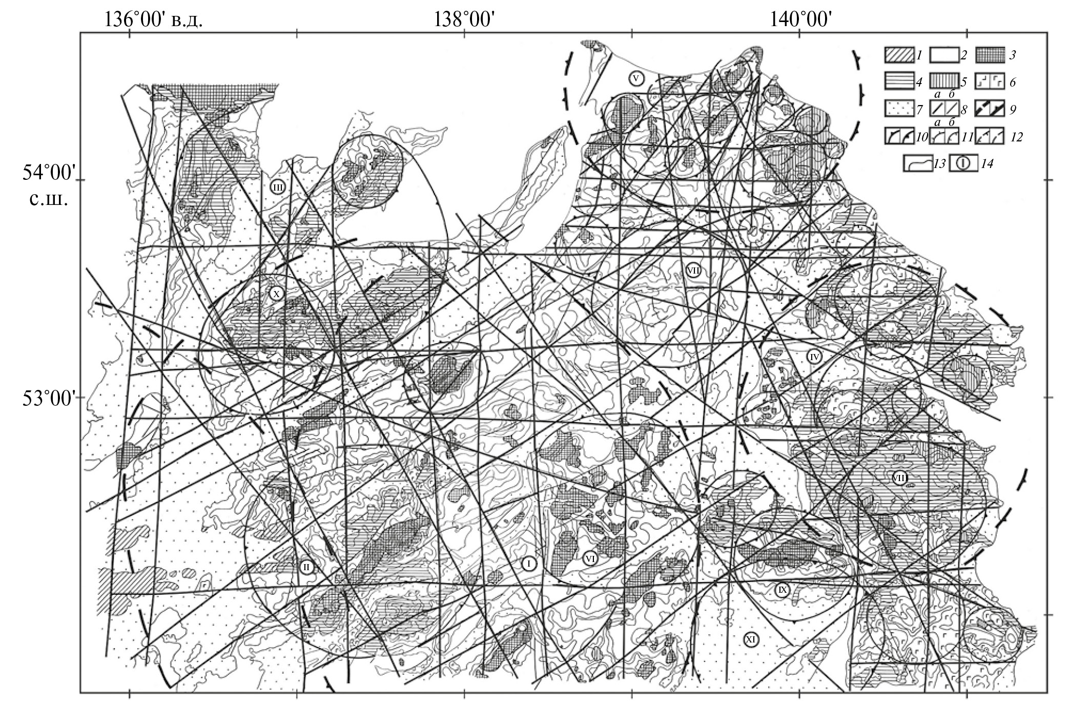 1–2 – осадочные и вулканогенно-осадочные комплексы разного возраста: 1 – палеозойского, 2 – мезозойского; 3–4 – магматические образования позднего мела: 3 – гранитоиды, 4 – эффузивы среднего и кислого состава; 5 – гранитоиды раннего палеогена; 6 – базальтоиды разного возраста (а – эоцена, б – миоцена); 7 – позднекайнозойские рыхлые отложения впадин; 8 – разломы, установленные по данным: а – дешифрирования КС и, б – геологическим; 9–11 – внешние контуры МЦТ разного типа и ранга: 9 – региональных поднятий (а – сводовых, б – тектономагматических), 10 – субрегиональных (а – интрузивно-купольных, б – вулканотектонических депрессий), 11 – локальных вулканических форм (а – положительных, б – отрицательных); 12 – предполагаемые дуговые граничные разломы локальных форм (а – отрицательных, б – прочих); 13 – геологические границы; 14 – римские цифры в кружках – названия основных МЦТ: I – Пильдо-Лимурийская, II – Эвурская, III – Ульбанская, IV – Усть-Амурская, V – Мевачанская, VI – Чаятынская, VII – Джапинская, VIII – Мынская, IX – Пуэрская, X – Омальская, XI – Удыльско-Кизинская.