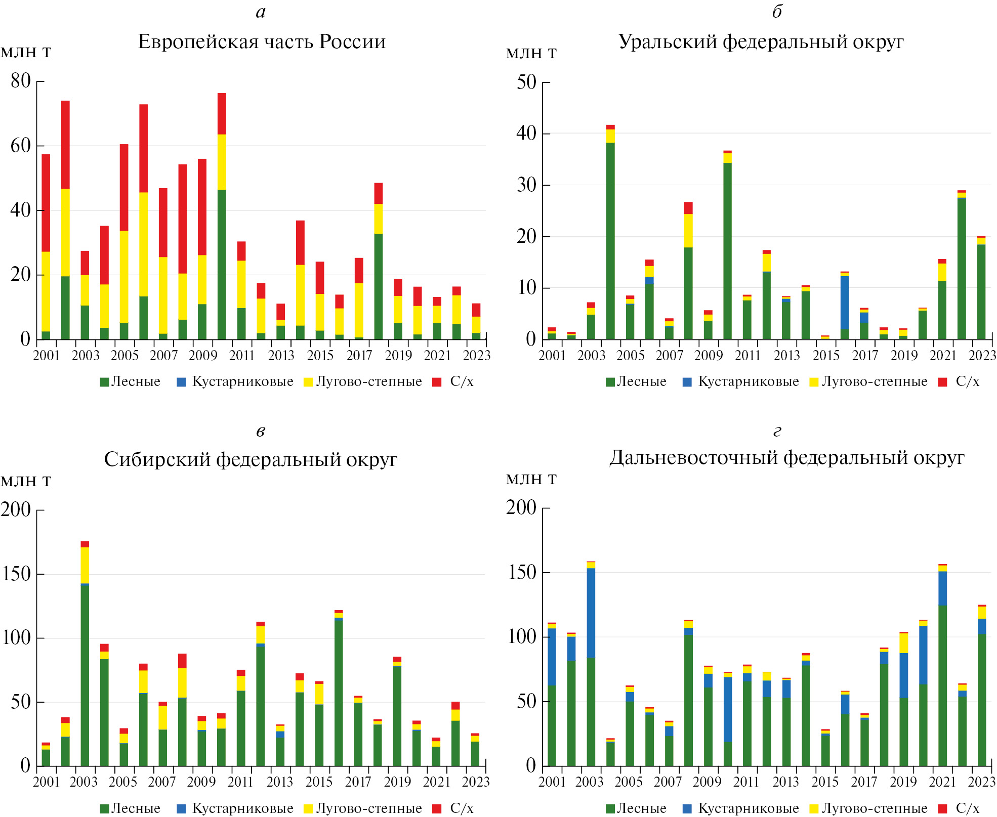 Из анализа рис. 2 следует, что распределения суммарных объемов эмиссий углеродосодержащих климатически активных газов при различных типах пожаров, происходивших на Европейской части территории России (см. рис. 2а), существенно отличаются от объемов таких эмиссий для территорий других федеральных округов Российской Федерации (см. рис. 2б, в, г). Основной вклад в эмиссии углеродсодержащих климатически активных газов на Европейской части территории страны вносили лугово-степные пожары и сельскохозяйственные палы. Исключениями являлись 2010 и 2018 годы, когда на Европейской части территории России происходили аномальные лесные пожары (Бондур и др., 2016, 2022). При этом, как видно из анализа рис. 2а, после 2010 года, объемы эмиссий углеродсодержащих климатически активных газов на Европейской части территории страны от лугово-степных пожаров и сельскохозяйственных палов значительно снизились.