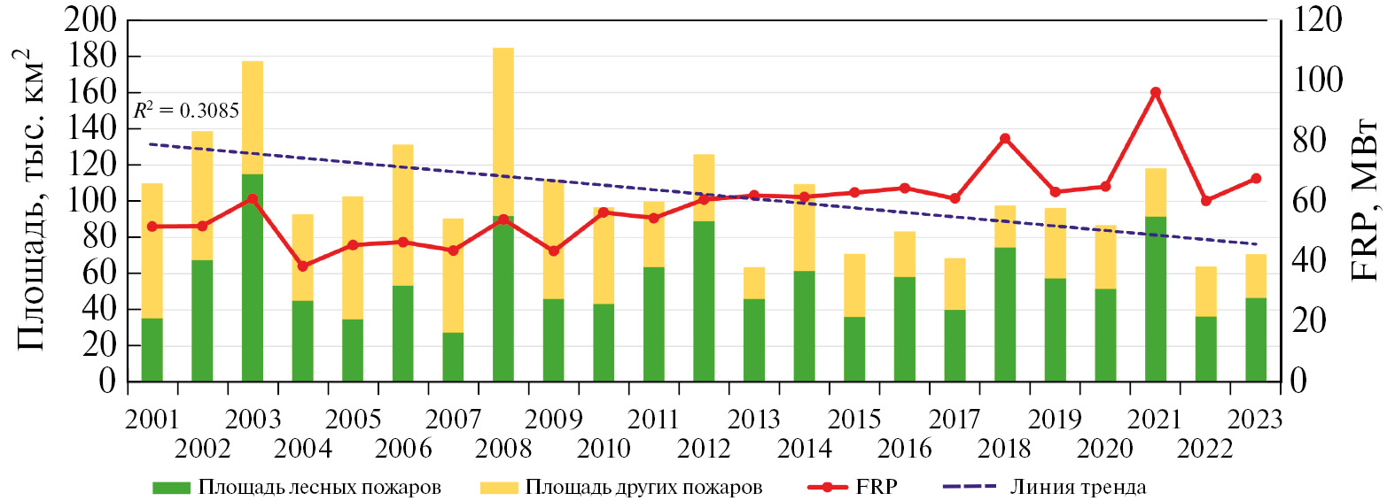 На рис. 6 иллюстрируется динамика ежегодных площадей всех типов пожаров, происходивших на всей территории Российской Федерации с 2001 по 2023 годы, а также ежегодных средних значений радиационной мощности пожаров (FRP), полученных с использованием спутникового информационного продукта MOD14 (Giglio, Justice, 2021), за этот период времени.