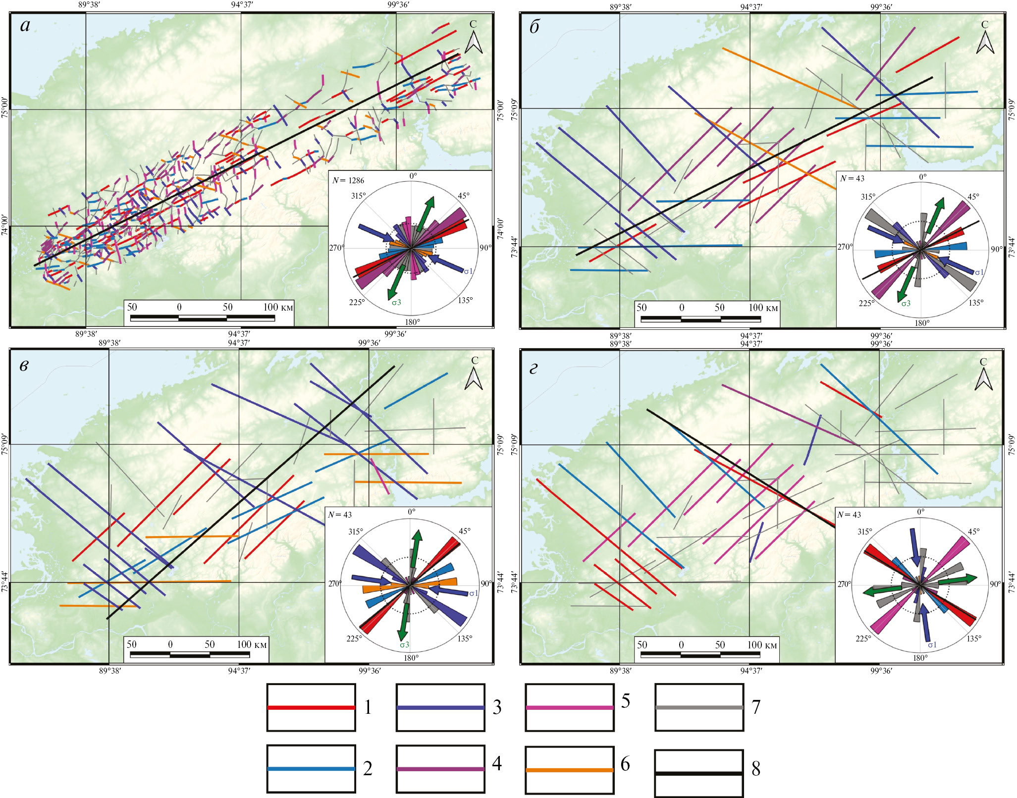 Рис. 8. а–г – Реконструкция ПНД для Главной Таймырско-Диабазовой блок-зоны на основе модели П.Л. Хэнкока для: протяженных линеаментов, выделенных вручную (а); трендов плотностей линеаметов: с линией сдвига, проведенной согласно трассе разлома (б); с линией сдвига, проведенной согласно преобладающей системе вторичных сколов (в); г – с линией сдвига, проведенной согласно северо-западной системе трендов линеаментов. 1 – Y-трещины; 2 – R-трещины; 3 – R’-трещины; 4 – P-трещины; 5 – X-трещины; 6 – T-трещины; 7 – не определено; 8 – “тренд” разлома (линия сдвига). Синие стрелки – ориентировка оси максимального сжатия; зеленые стрелки – ориентировка оси максимального растяжения. N – количество объектов, использованных для построения розы-диаграммы.