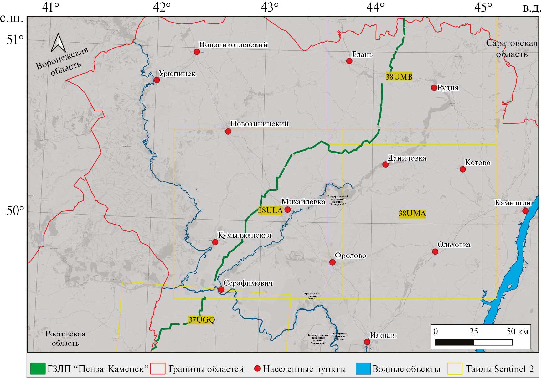 Рис. 1. Тайлы использованных снимков и расположение ГЗЛП “Пенза–Каменск” относительно населенных пунктов на территории Волгоградской области.