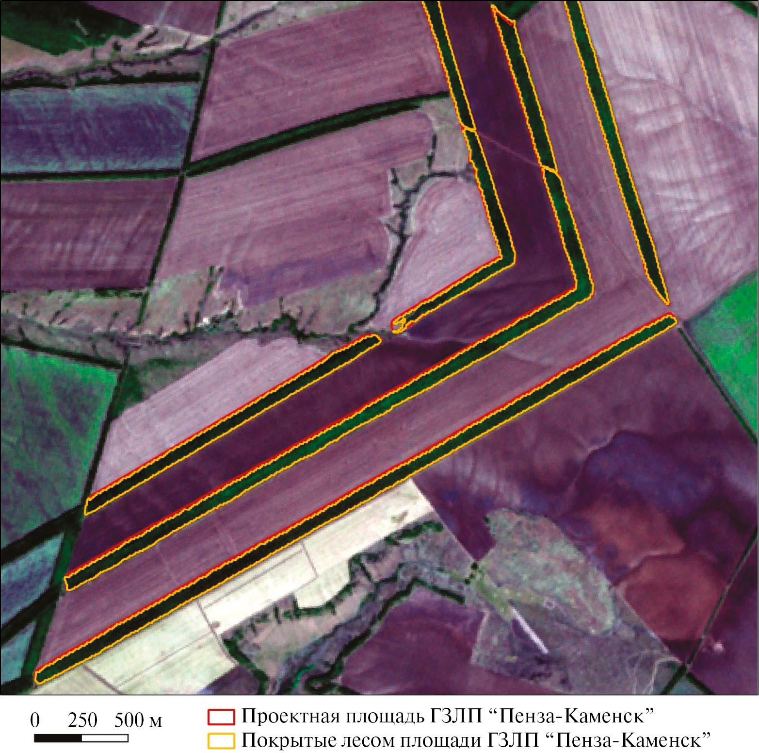 Рис. 3. Пример выделения проектной и покрытой лесом площади ГЗЛП “Пенза–Каменск” с помощью NDVI.