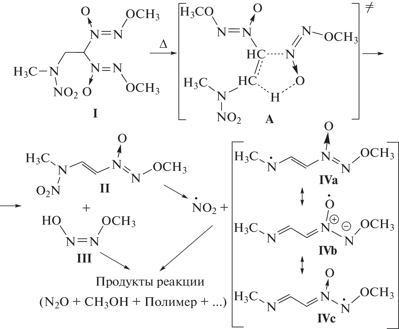 The thermal decomposition of 1,1-bis(methoxy-NNO-azoxy)-3-nitro-3-azabutane is studied under isothermal and nonisothermal conditions. The heats of its melting and thermal decomposition are 29.1 kJ/mol (7.0 kcal/mol) and 387 kJ/mol (92.5 kcal/mol), respectively. The composition of gaseous products of thermal decomposition is analyzed. The reaction takes place autocatalytically. The reaction center in the molecule of the studied substance is the diazene oxide group. The mechanism of the process is proposed. The limiting stage of the reaction includes a five-membered cyclic transition state.