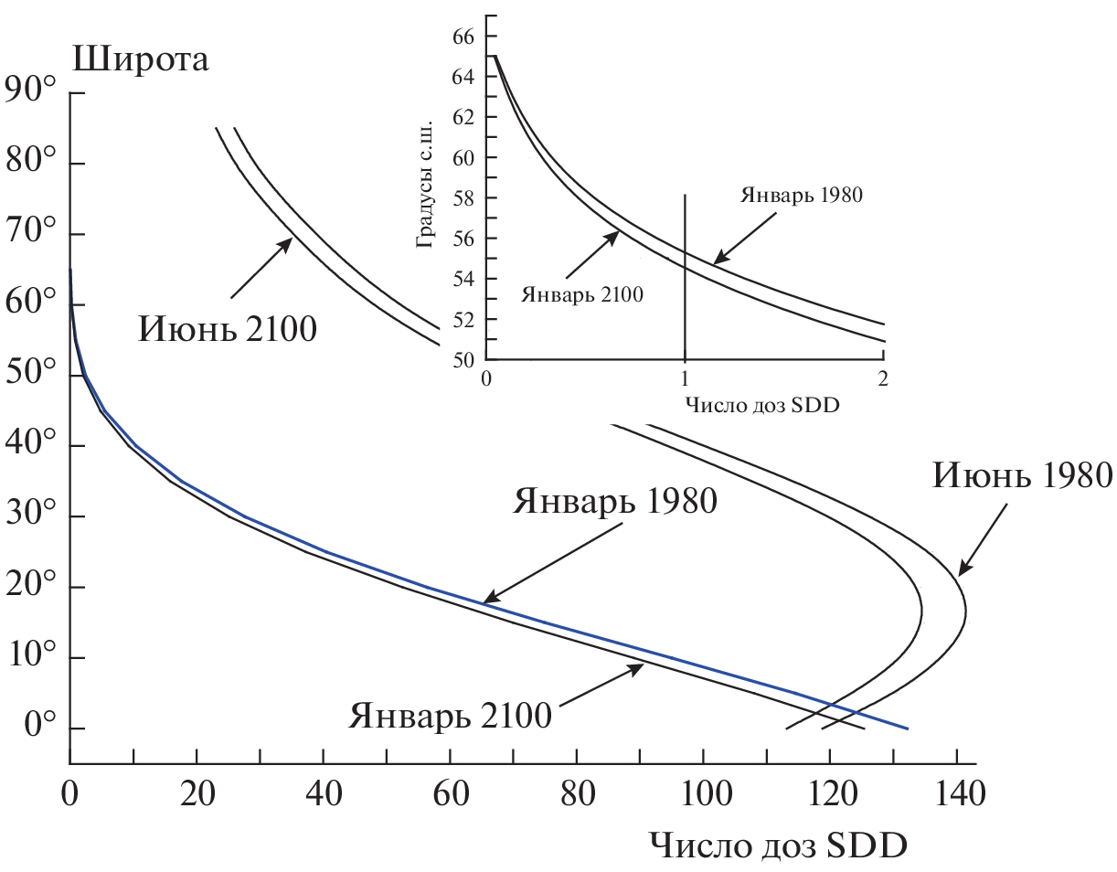 Data on the ozone content in June and January of 1980 and 2100 obtained using the SOCRATES two-dimensional interactive model of the average atmosphere are presented. Based on these data, using the Fast simulation of downward UV doses, indices and irradiances at the Earth’s surface program developed at the Norwegian Institute for Atmospheric Research, the change in the main factors of biologically active solar radiation by the end of the 21st century, including data related to the formation of erythema and vitamin D in humans, is calculated. It is shown that the parameters of biologically active radiation by the end of the 21st century may change compared to 1980; however, this will not pose a significant threat to human health.