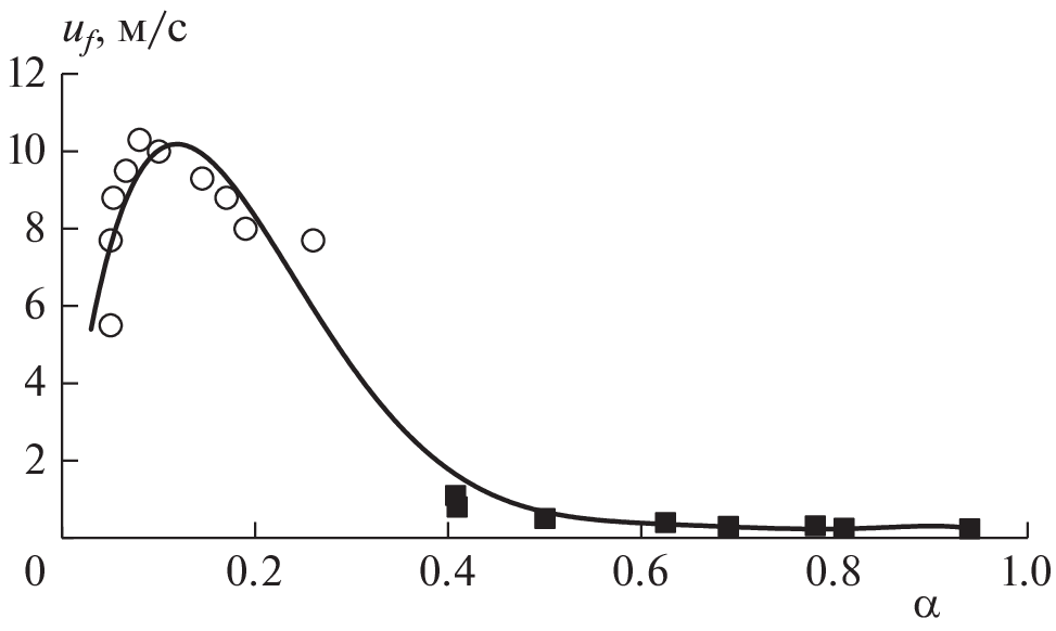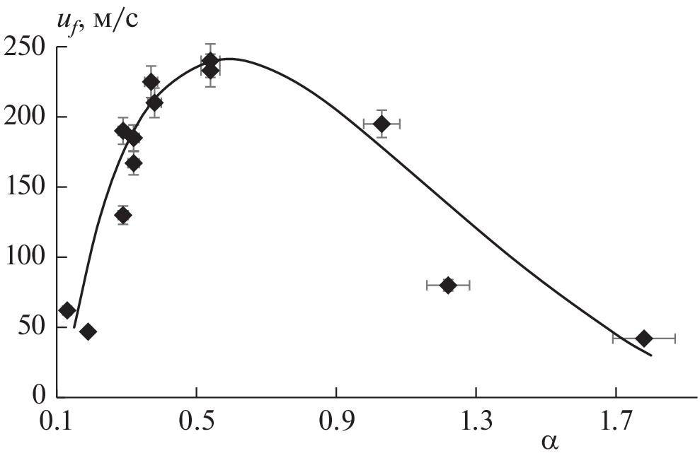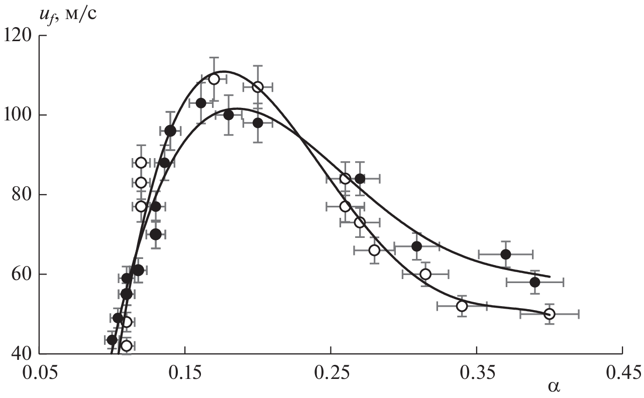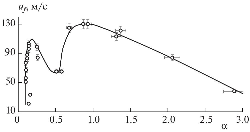 The results of experimental studies on the effect of gas-dispersed parameters of the flow of an air suspension of aluminum particles—the average particle diameter d32 and excess air coefficient α—on the flame propagation velocity are presented. The dependences of the apparent flame propagation velocity, uf, on the coefficient of excess air α for ASD-1-grade aluminum powder with d32 = 17.4 µm and ASD-4-grade aluminum powder with d32 = 7.4 µm are obtained. It is established that the number of maxima and their location on the dependence graph uf(α) depend on the particle combustion mode, which in turn is determined by the particle size. For both powder grades, there is a maximum on the dependence graph uf(α) in the rich region (α ≈ 0.2). For aluminum particles with d32 = 17.4 µm, the flame propagation velocity decreases monotonically with increasing α. For particles with d32 = 7.4 µm, whose combustion occurs in the kinetic mode, there is a second maximum in the region of stoichiometric air suspension compositions (α ≈ 1.0). The number and location of maxima and their variation depending on the average diameter d32 allows us to draw certain conclusions about the combustion mechanism of aluminum particles.