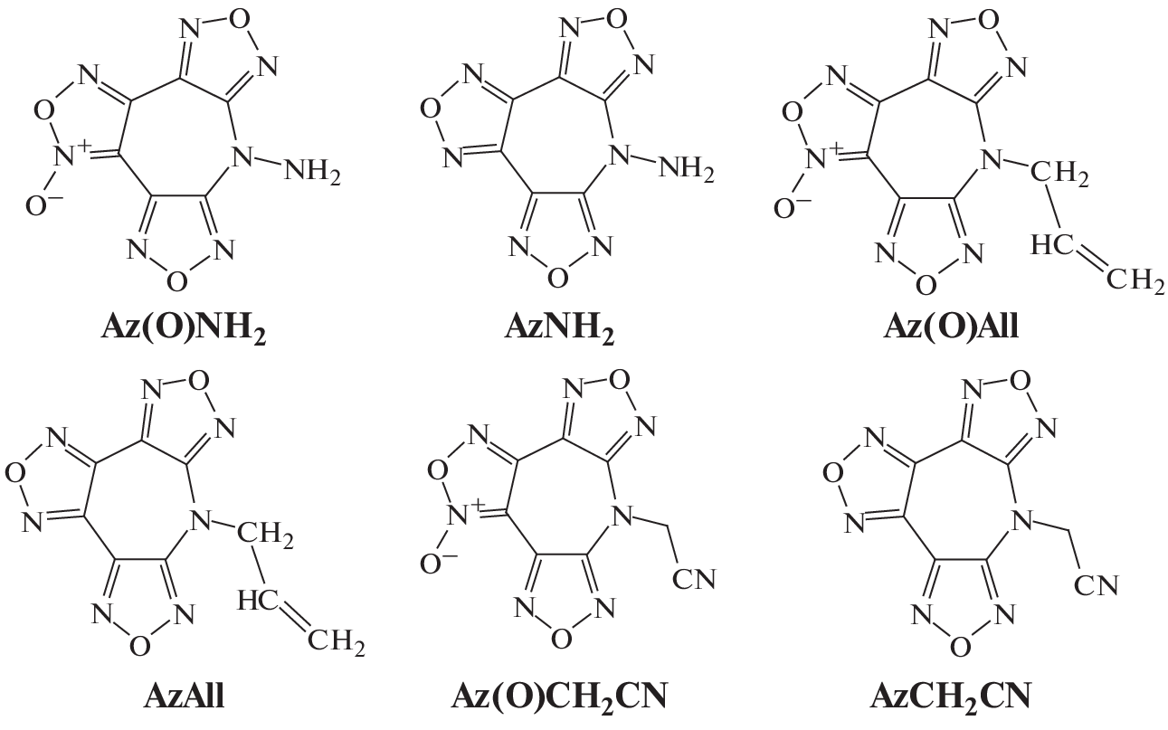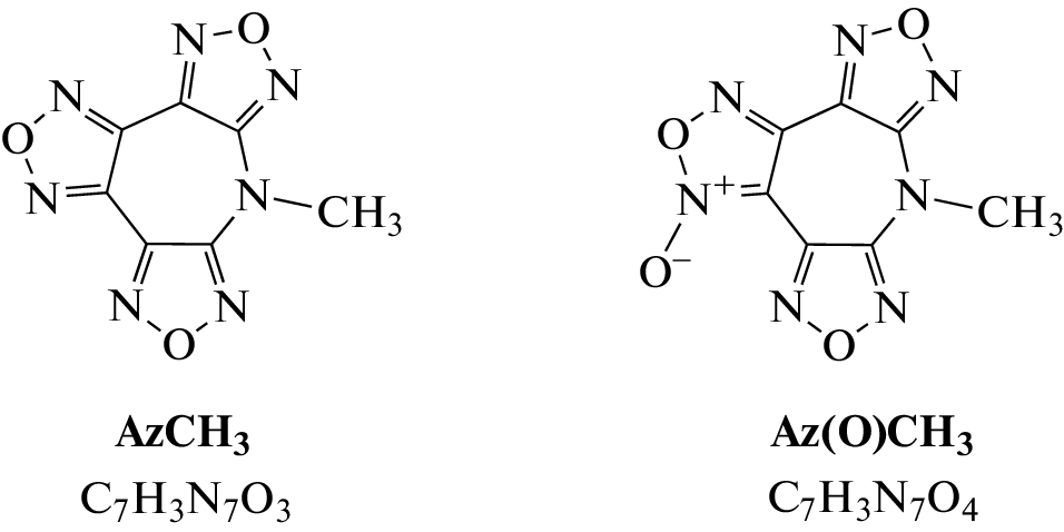 Energy-intensive compounds AzCH3, 7-methyl-7Н-trifurazano[3,4-b:3′,4′-f:3″,4″-d]azepine, and Az(O)CH3, 7-methyl-7Н-difurazano[ 3,4-b:3′,4′-f]furoxano[3″,4″-d]azepine, are extensively studied as potential dispersants in gas-generating fuels. The main parameters of the crystal lattice are determined by X‑ray diffraction analysis and experimental data on the heats of combustion and enthalpies of the formation of AzCH3 and Az(O)CH3 are obtained. A thermodynamic analysis of the effectiveness of these compounds in gas-generating fuels is carried out. It is shown that AzCH3 and Az(O)CH3 are very effective as potential dispersants of solid fuels for gas generator engines.