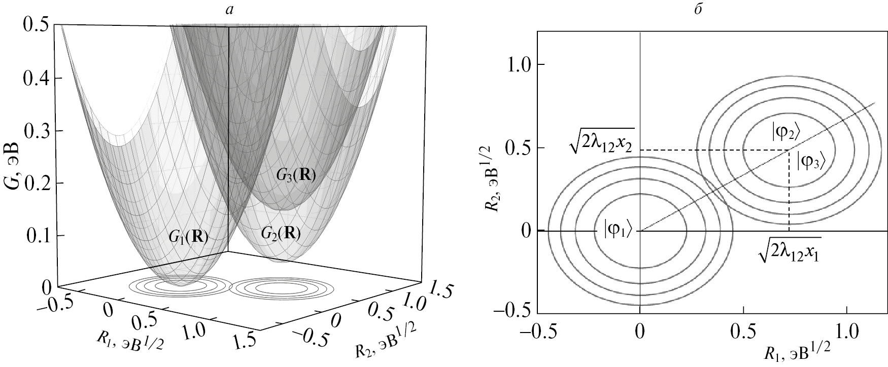 Рис. 2. а — Поверхности свободной энергии G системы в подпространстве релаксационных координат R, полученные путем ортогонального проецирования из пространства q. Значения параметров модели такие же, как и на рис. 1. Значения весовых коэффициентов x1 и x2 соответствуют ацетонитрилу (указаны в тексте). б — Расположение точек минимума ПСЭ на плоскости (R1, R2) — вдоль прямой линии, заданной уравнением R2 /R1 = x2/x1.