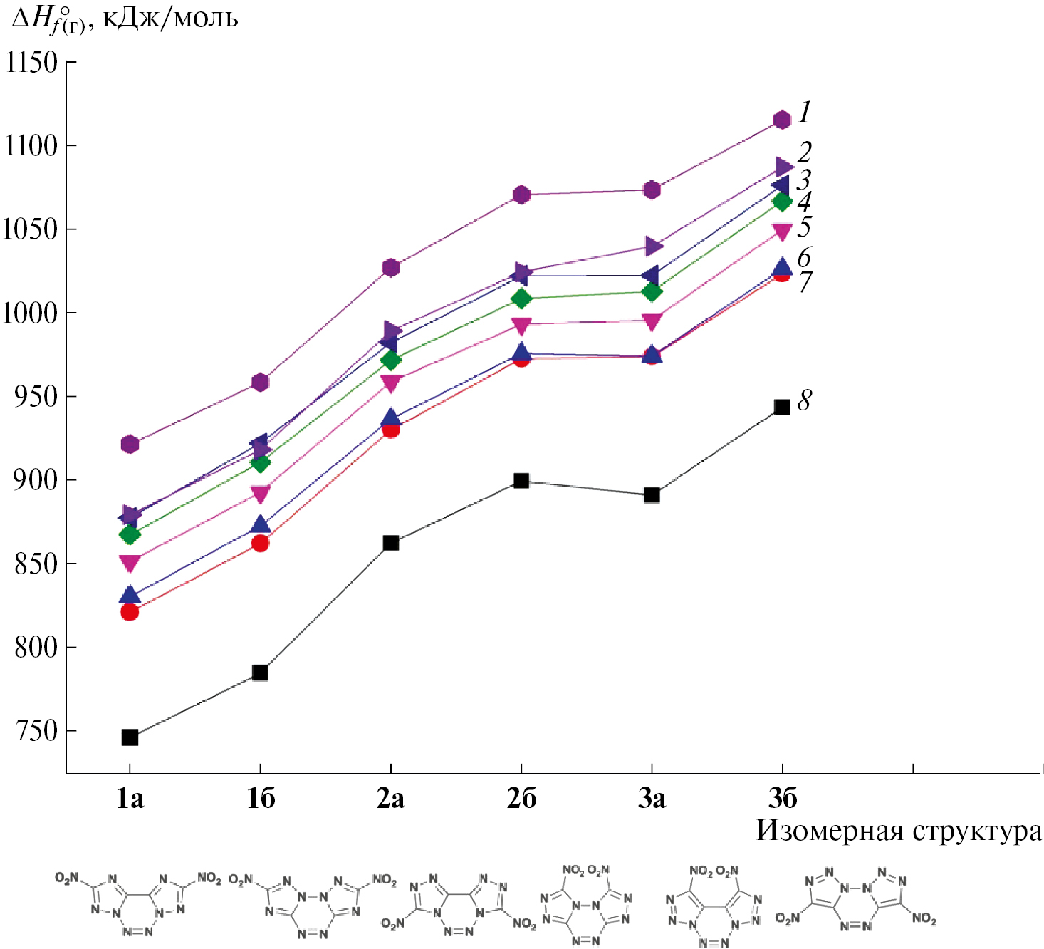 Рис. 3. Изменение энтельпии образования в газовой фазе (кДж/моль) в ряду исследуемых изомеров 1а,б–3а,б. Расчет методом B3LYP/6-311+G(2d,p) — 1, M062X/6-311+G(2d,p) — 2, G4MP2 — 3, G4 — 4, CBS-APNO — 5, CBS-QB3 — 6, ωB97XD/aug-cc-pVTZ — 7, CBS-4M — 8.