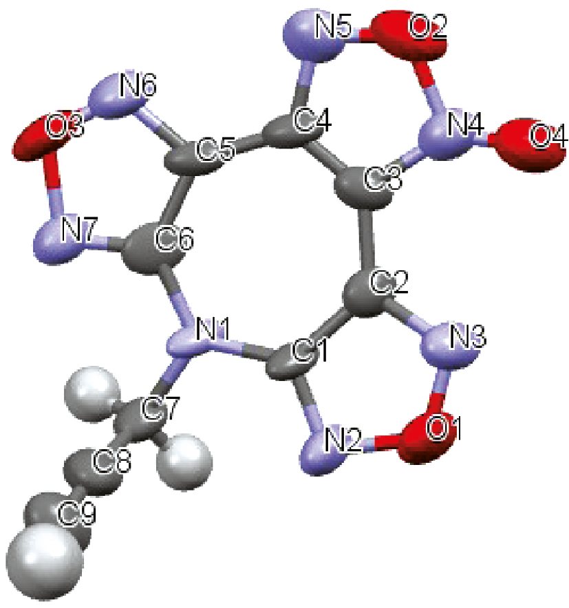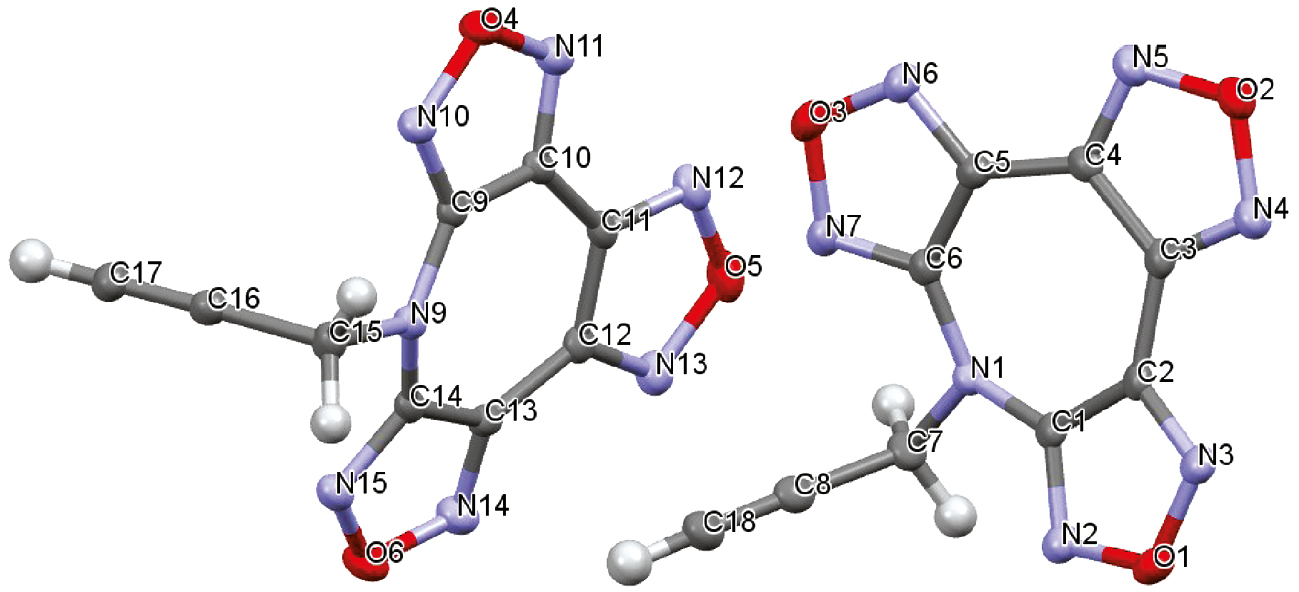 Для оценки величины энтальпии образования Az(O)Prg можно предположить, что разница в энтальпиях образования AzPrg и Az(O)Prg будет такой же, как и между величинами энтальпий образования AzAll и 7-аллил-7Н-дифуразано[3,4-b:3′,4′-f]фуроксано[3″,4″-d]азепина (Az(O)All) [14] вследствие вероятной одинаковости вида и числа укороченных диполь-дипольных взаимодействий (контактов) между функциональными группами при упаковке в кристалле молекул, содержащих близкие по строению пропаргильные и аллильные группы. При этом предположении энтальпия образования Az(O)Prg должна составлять 904.4 кДж/моль.