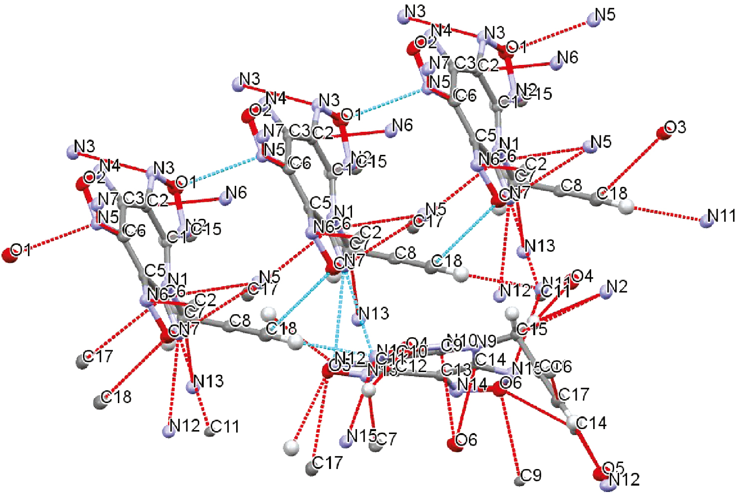 Энергии этих взаимодействий лежат в интервалах 35.6–42.7 и 20.9–40.6 кДж/моль для AzPrg и Az(O)Prg соответственно. Обнаружено, что замена одного фуразанового цикла на фуроксановый (переход от AzPrg к Az(O)Prg) несколько понижает как энергию отдельных парных взаимодействий, так и общую энергию кристаллической упаковки. Таким образом, соединение Az(O)Prg является не только менее плотным в силу наличия пустот в кристаллической структуре, но и энергетически менее выгодным по сравнению со структурой AzPrg.