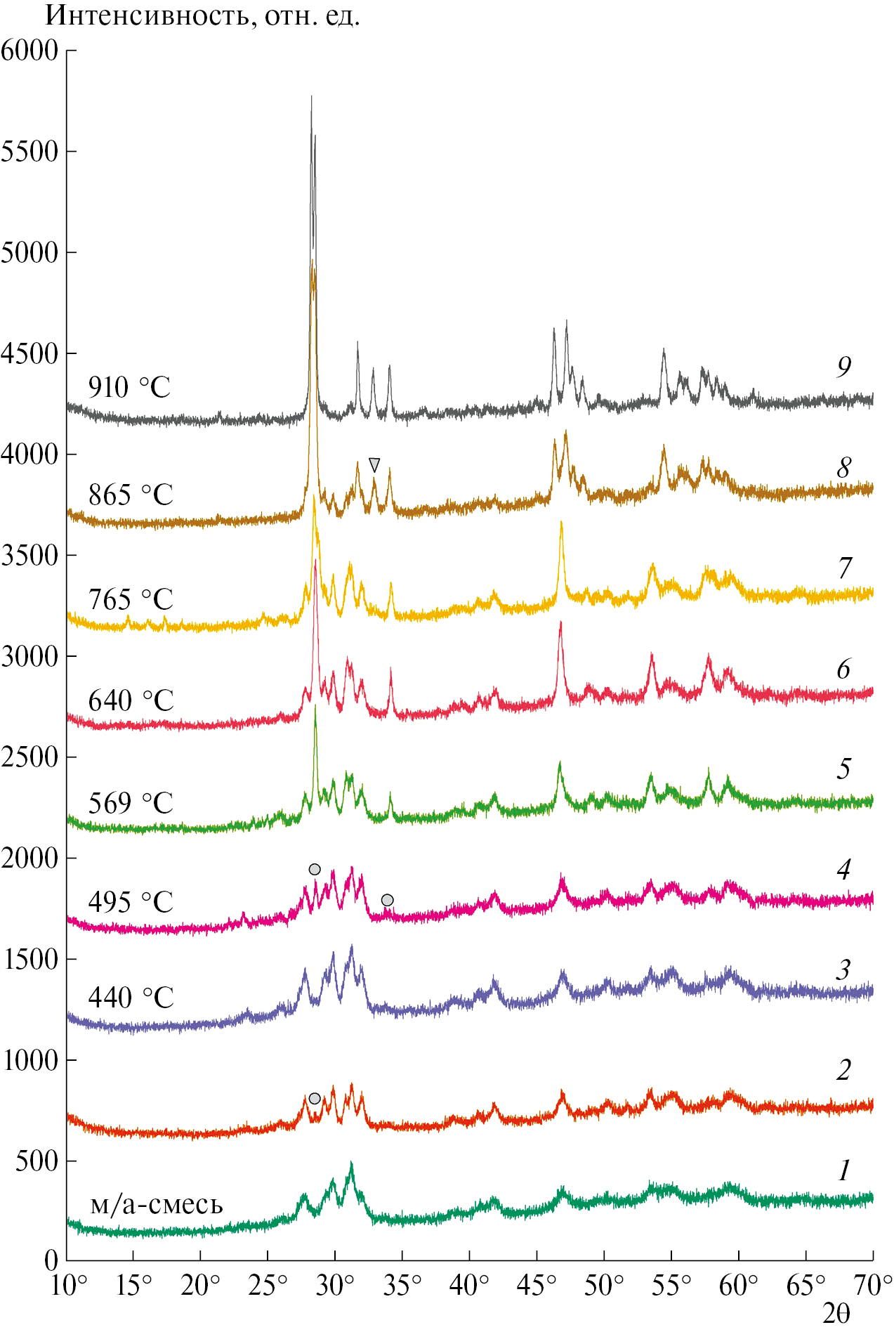 Рис. 1. Дифрактограммы смеси оксидов Sm2O3+MoO3: 1 – после механической активации при комнатной температуре в течение 1 ч, 2 – после изотермической выдержки в течение 220 ч м/а-смеси при температуре 340 °С, после нагрева м/а-смеси в камере ДСК до (3) 440, (4) 495, (5) 569, (6) 640, (7) 765, (8) 865, (9) 910 °С. Кружками отмечены положения линий фазы Sm2(MoO4)3. Треугольник указывает на пик плоскости (202) фазы шеелита Sm2MoO6.