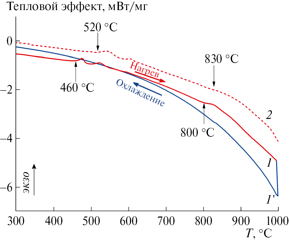 Рис. 2. Данные ДСК м/а-смеси оксидов Sm2O3 + MoO3 в режиме нагрева (1 ), охлаждения (1 ′) и смеси, измельченной в ступке без предварительной активации, в режиме нагрева (2 ) со скоростью 10 °С/мин.