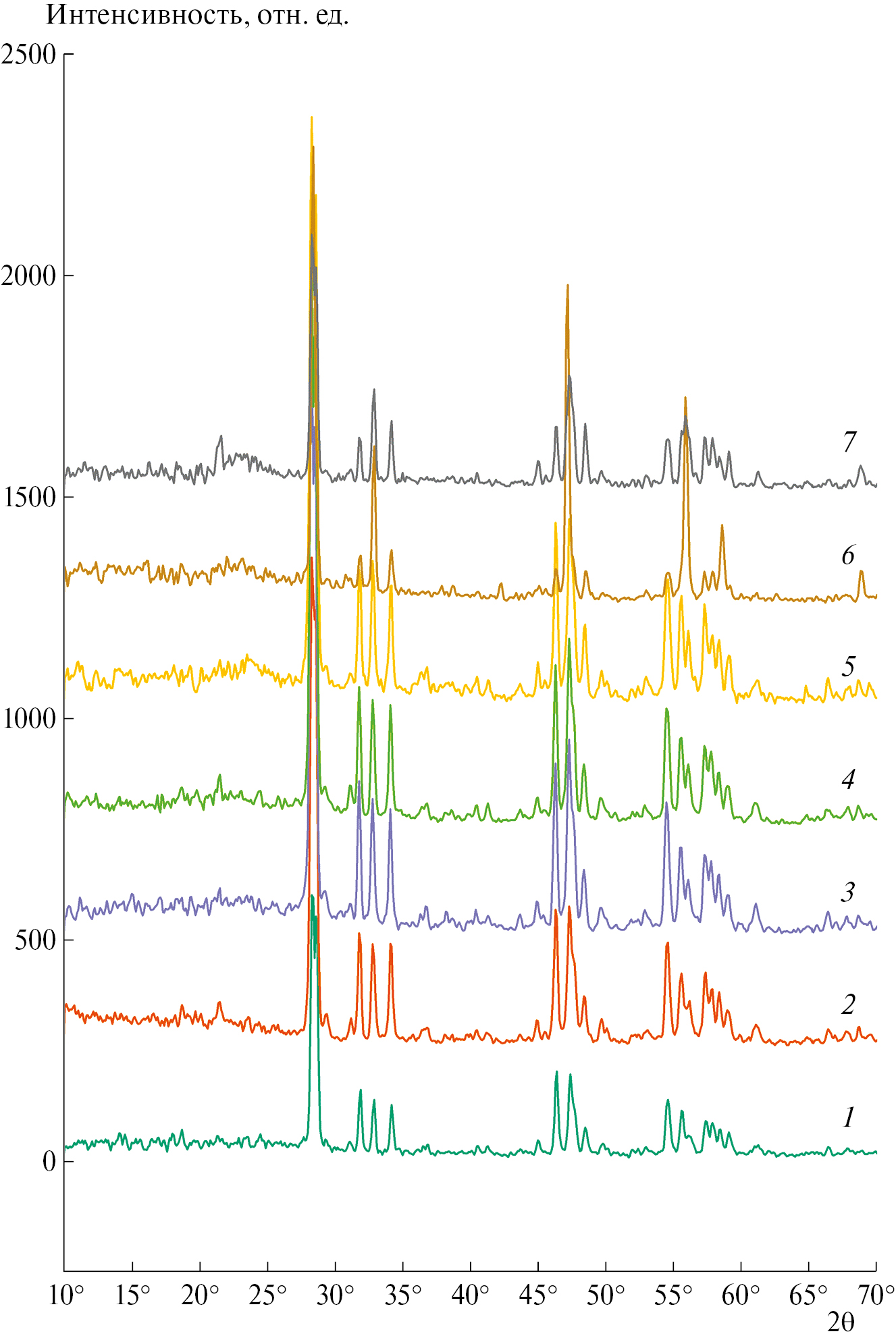 Рис. 3. Дифрактограммы керамик, полученных при отжиге механоактивированной смеси оксидов Sm2O3+MoO3: 1 – 900 °С 48 ч; 2 – 1200 °С 4 ч; 3 – 1300 °С 2 ч; 4 – 1400 °С 1 ч; 5 – 1400 °С 1 ч + 1500 °С 1 ч; 6 – 1500 °С 1 ч; 7 – 1600 °С 1 ч.