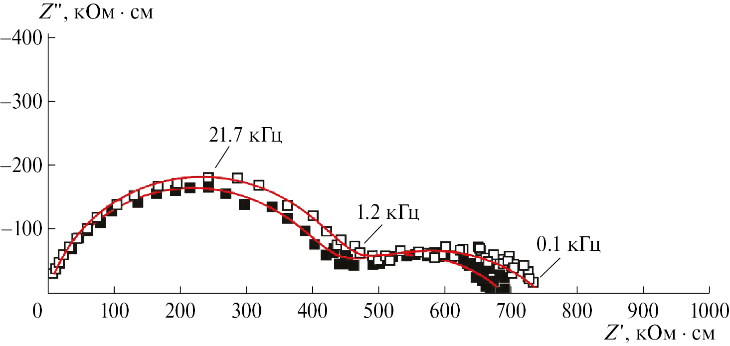 Рис. 4. Годограф импеданса моноклинной фазы Sm2MoO6 в сухом (■) и влажном (□) воздухе при 613 °С; сплошные линии – подгоночные кривые.