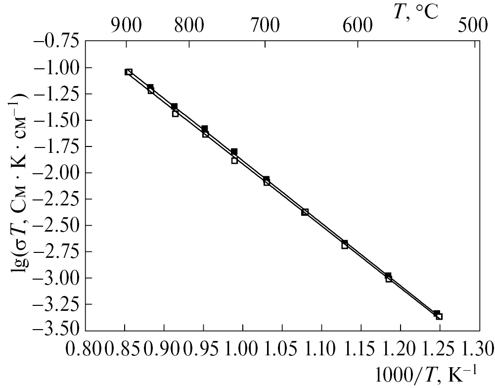 Для измерений проводимости на образец керамики Sm2MoO6, синтезированный при 1400 °С в течение 1 ч, а затем при 1500 °С также в течение 1 ч и представляющий собой цилиндр диаметром 9 мм и высотой 4 мм, были нанесены электроды путем вжигания платиновой пасты ChemPur C3605 при температуре 1000 °С. Измерение проводимости методом импеданс-спектроскопии проводили при помощи потенциостата/гальваностата P-5X в частотном диапазоне от 0.1 Гц до 500 кГц и интервале температур 500–900 °С в сухом и влажном воздухе в режиме охлаждения. Сухая атмосфера создавалась при прохождения воздушного потока через KOH (pH2O = 2.6 · 10−6 атм), а влажная – при прохождении воздушного потока через водяной сатуратор, выдерживаемый при 20 °С, что обеспечивало постоянную влажность в 2.3% (pH2O = 0.023 атм). С целью достижения равновесного состояния перед измерением проводимости образец выдерживали при каждой температуре в течение по меньшей мере 40 мин.