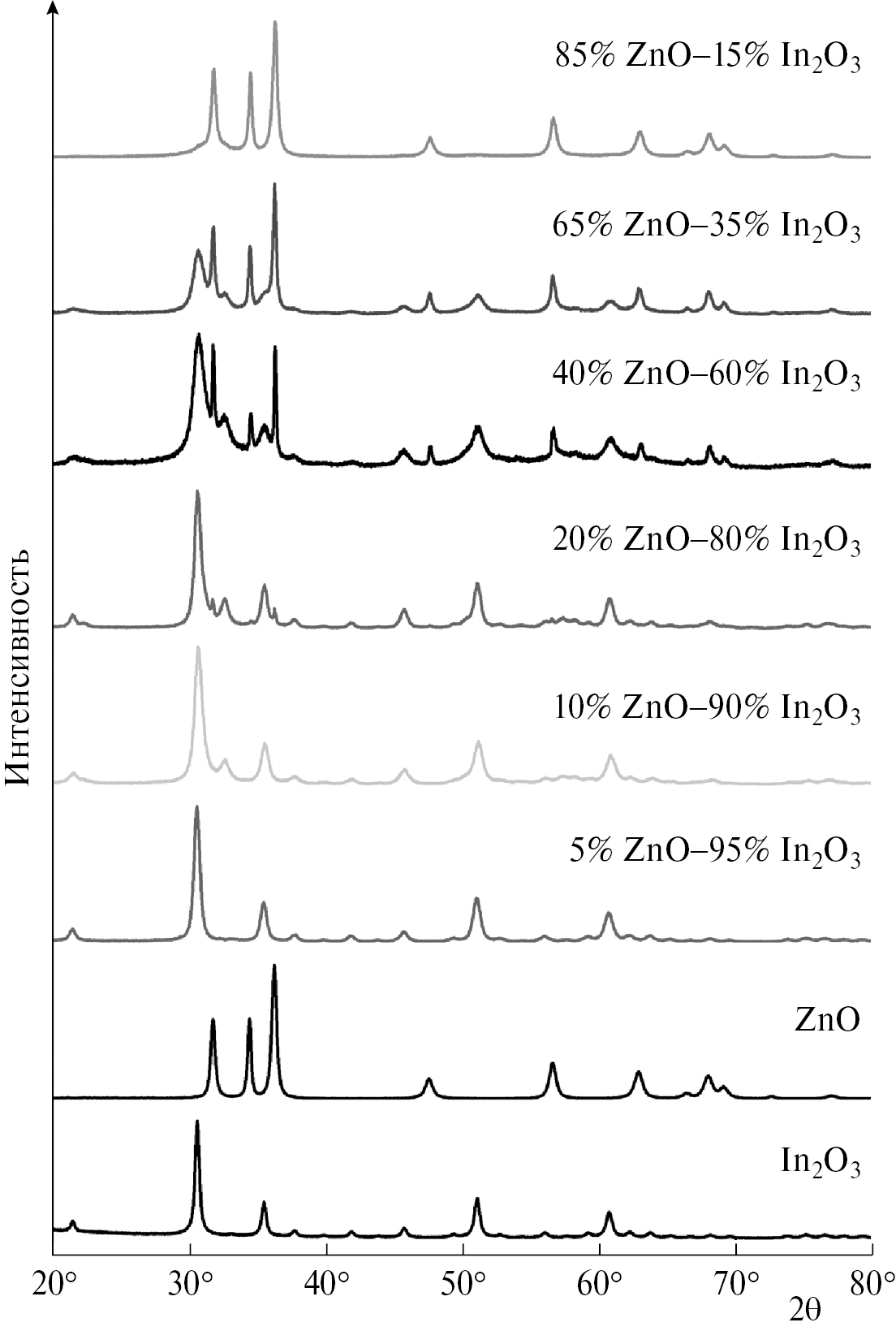 На рис. 1 представлены XRD-спектры композитов ZnO–In2O3 с различным содержанием оксида цинка, синтезированных гидротермальным методом. Независимо от содержания оксида цинка в композитах во всех синтезированных композитах регистрируются пики при дифракционных углах 21.5°, 30.6°, 35.5°, 51.0°, 60.6°, которые относятся соответственно к плоскостям (211), (222), (400), (440) и (622) кубической модификации In2O3. В композитах, синтезированных гидротермальным способом и содержащих до 20% ZnO, не наблюдалось явных дифракционных пиков ZnO, что может быть связано с внедрением ионов Zn в решетку оксида индия или образованием рентгенаморфной оксидной фазы. При содержании оксида цинка в композитах более 20% на спектрах появляются пики при углах 31.79°, 34.44°, 36.26°, 47.53°, 56.59°, 62.85°, 67.97°, соответствующие рефлексам ZnO со структурой вюрцита. В гидротермальных композитах положение дифракционного пика, соответствующего плоскости (222) оксида индия, смещается в сторону больших углов по сравнению с положением чистого In2O3, синтезированным также гидротермальным методом в отсутствие ZnO (см. табл. 1). Поскольку ионный радиус Zn (0.74 Å) меньше, чем радиус In (0.81 Å), смещение этого пика указывает на то, что Zn частично встраивается в структуру In2O3.