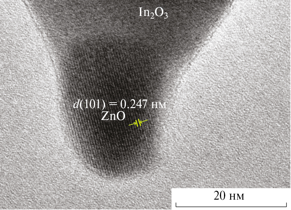 В отличие от гидротермального метода, метод импрегнирования приводит к образованию только двухфазных систем ZnO–In2O3 при различном содержании оксида цинка (см. табл. 1). Согласно данным XRD размер частиц оксидов индия и цинка в композитах, полученных методом импрегнирования, практически не изменяется в зависимости от содержания ZnO (табл. 1). Однако данные ТЭМ показали, что размер наночастиц оксида цинка, наблюдаемых в импрегнированных образцах ZnO–In2O3 при концентрации оксида цинка от 5 до 60%, составляет приблизительно 20–25 нм (см. рис. 3), а при содержании ZnO более 60% размер частиц последнего уменьшается и составляет приблизительно 5–10 нм. Из рис. 3 видно, что на поверхности относительно крупных наночастиц оксида индия (до 100 нм) появляются наночастицы оксида цинка с близкой к сферической формой.