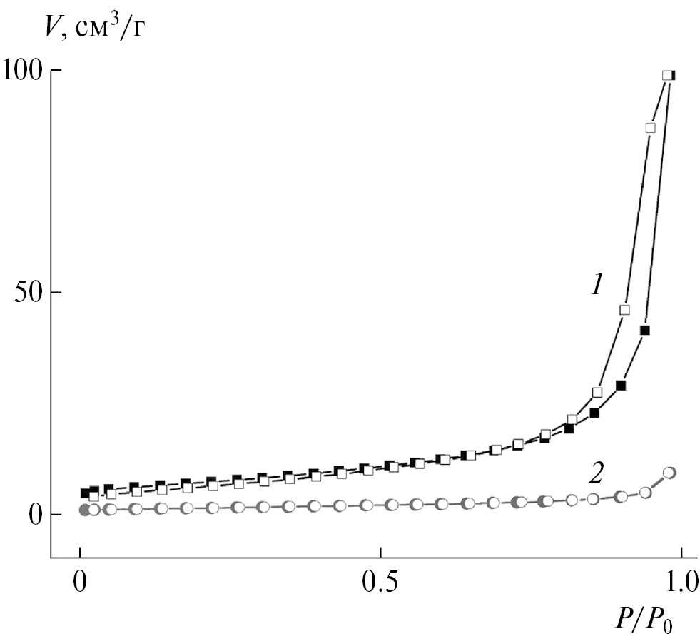Рис. 4. Изотермы адсорбции (заполненные символы) и десорбции (пустые символы) N2 при температуре 77 К: 1 – импрегнированный образец 5%ZnO–95% In2O3, 2 – гидротермальный образец 5%ZnO–95%In2O3.