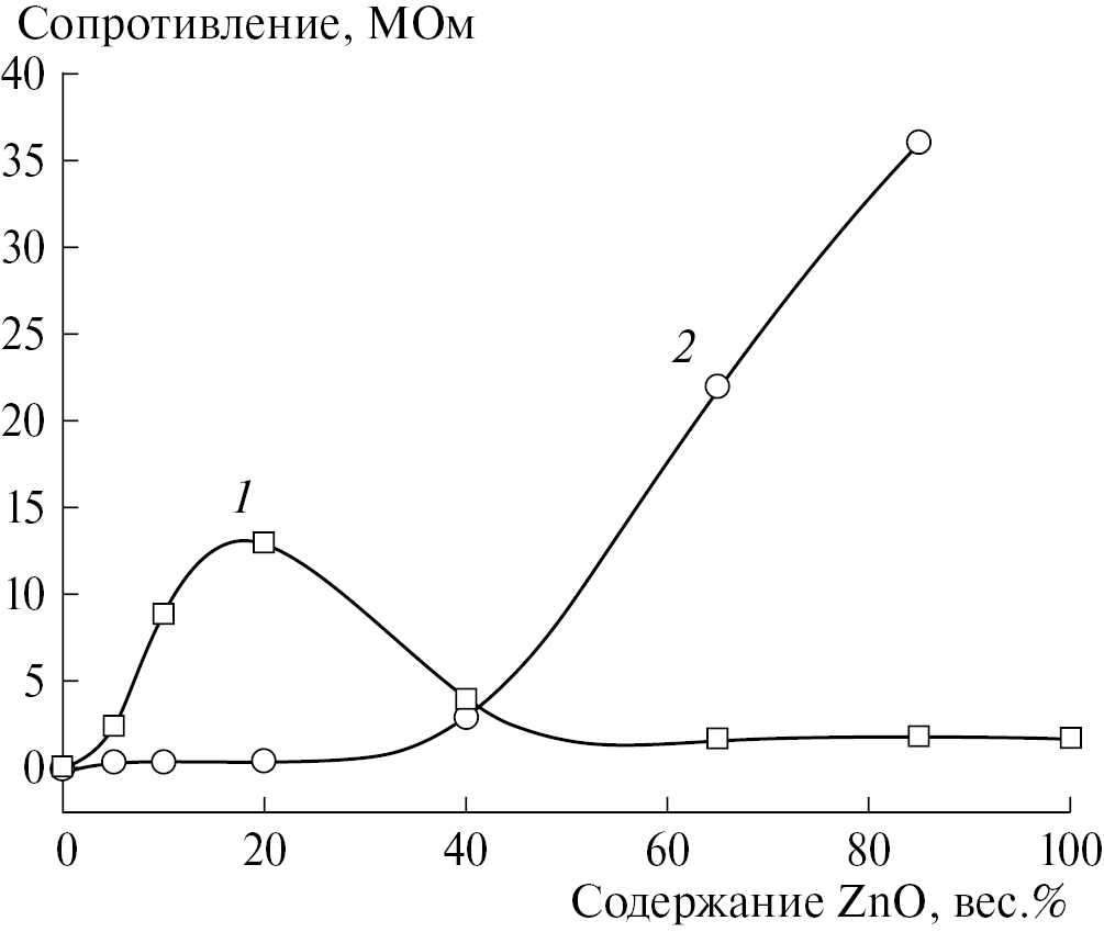 При рассмотрении композитов ZnO–In2O3, полученных гидротермальным методом следует иметь в виду, что при содержании оксида цинка до 20% в системе не формируется частицы ZnO, а ионы цинка внедряются в матрицу оксида индия. Это приводит к модификации электронной структуры In2O3 и снижению концентрации электронов проводимости, что повышает сопротивление нанокристаллов In2O3 (рис. 5). Увеличение сопротивления в композитах, содержащих до 20% оксида цинка, обусловлено образованием дырок, так как ионы Zn2+ будут являться акцепторами при замещении In3+ в кристаллической решетке In2O3. При этом электроны будут компенсироваться дырками, генерируемыми акцепторами и, следовательно, сопротивление будет увеличиваться. Внедрение цинка в структуру оксида индия способствует образованию дефектов p-типа и, следовательно, увеличивает сопротивление гидротермальных образцов, содержащих до 20% оксида цинка в системе.