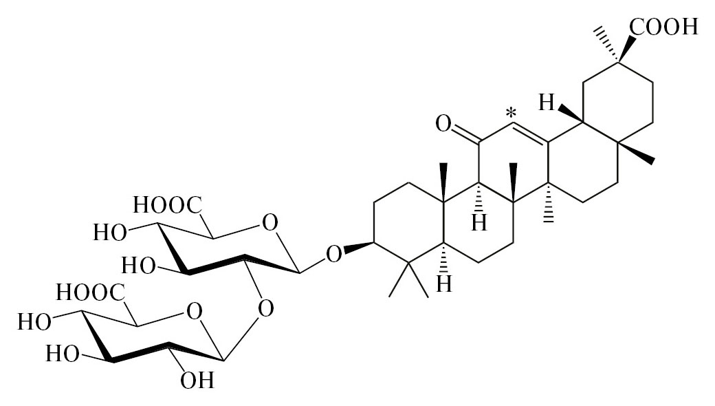 Рис. 1. Структурная формула глицирризина. Звездочкой отмечен протон, возбуждение которого проводилось в экспериментах sNOESY.