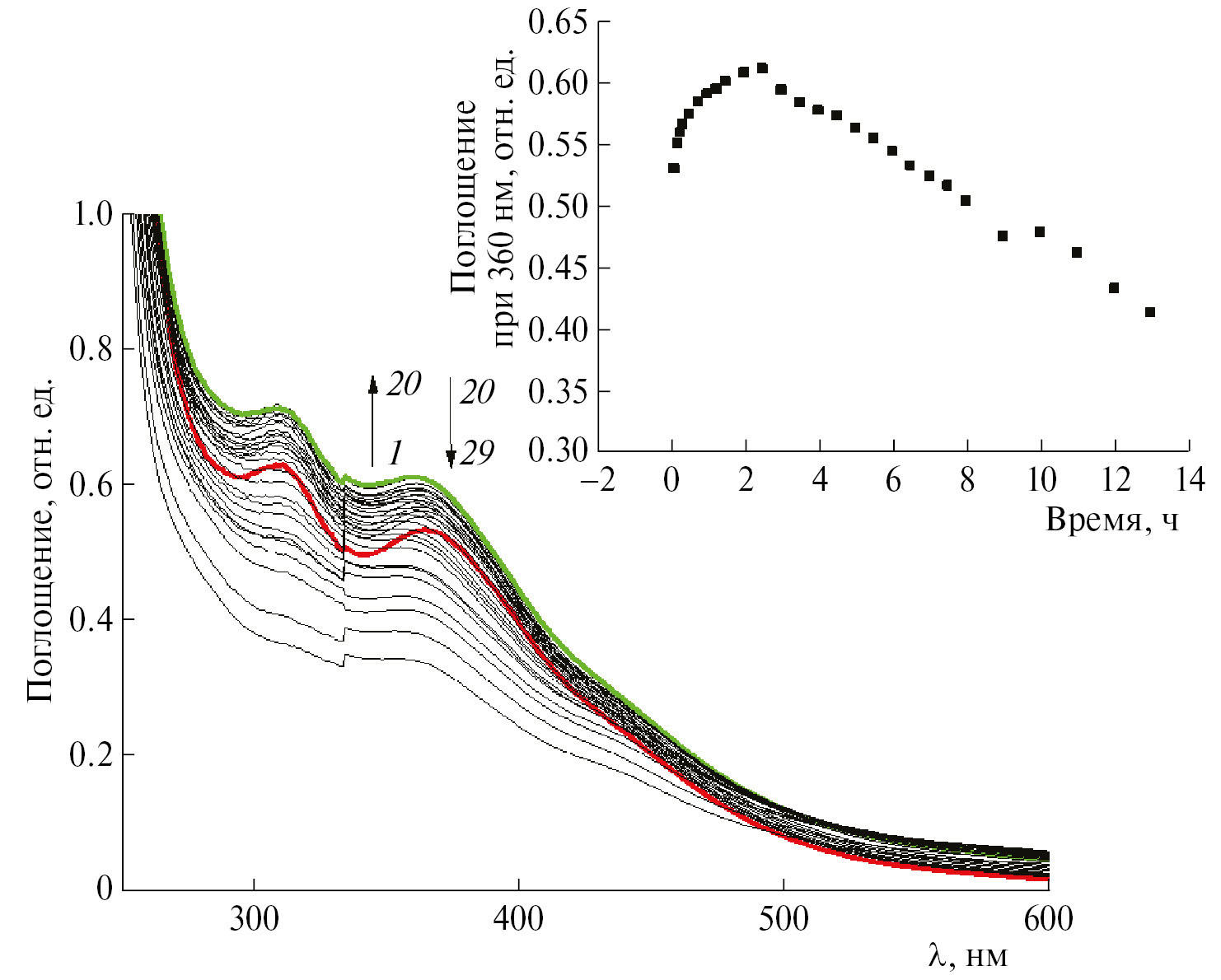 УФ-спектры поглощения регистрировали в диапазоне длин волн 200–600 нм через определенные интервалы времени при комнатной температуре на спектрофотометре Cary 60 UV-Vis производства компании Agilent Tech. (USA).