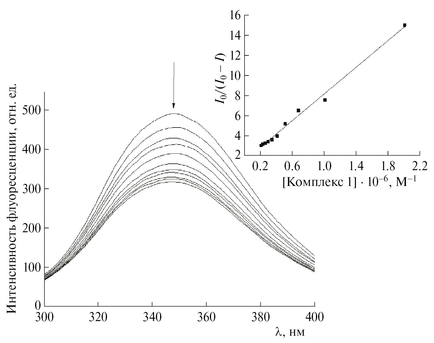 Рис. 5. Влияние комплекса 1 на спектры флуоресценции BSA. Условия: начальные концентрации комплекса 1 — 0; 0.5 ‧ 10–6; 1 ‧ 10–6; 1.5 ‧ 10–6; 2 ‧ 10–6; 2.47 ‧ 10–6; 2.95 ‧ 10–6; 3.43 ‧ 10–6; 3.91 ‧ 10–6; 4.38 ‧ 10–6; 4.86 ∙ 10–6 М, BSA –1 ∙ 10–6 М, lex = 290 нм, 0.05 M Трис-HCl-буфер pH 7.0, температура — 23 °C. На вставке представлена кривая Штерна–Фольмера системы BSA–комплекс 1.